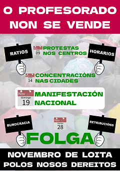 Após o éxito da folga do pasado 24 de outubro e da asistencia masiva á manifestación, os tres sindicatos continuarán con accións de presión até conseguir melloras para todo o persoal docente e para o conxunto do ensino público