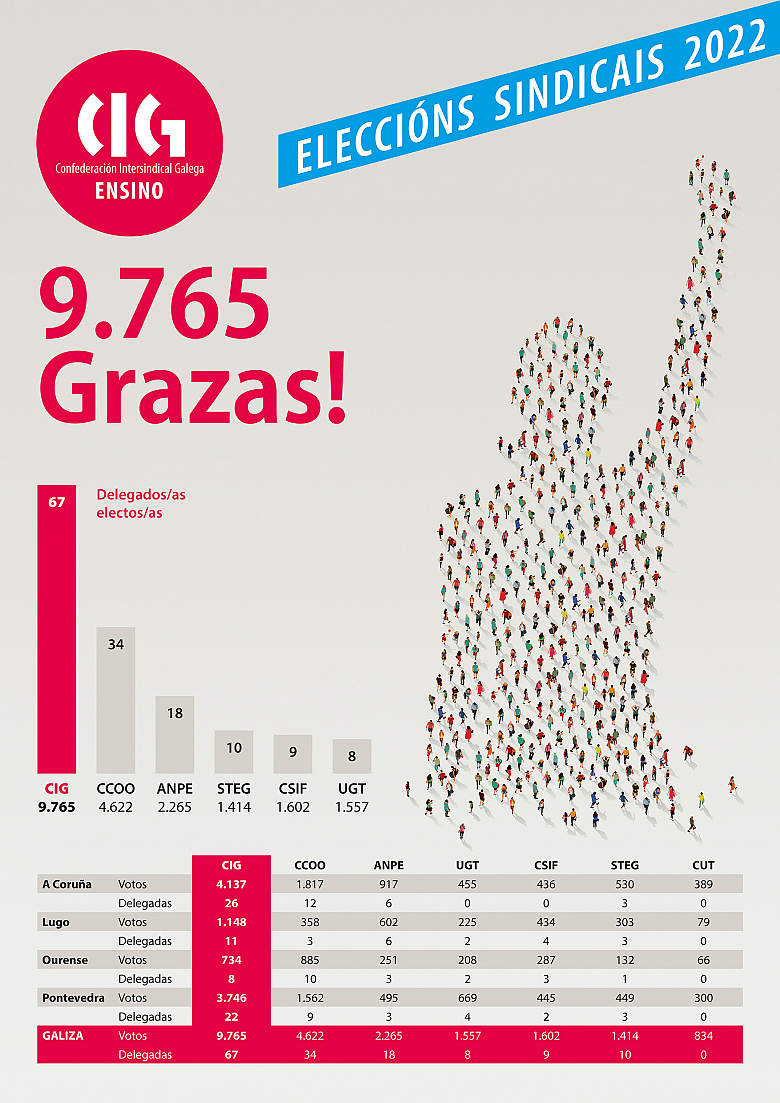 Co 100% dos votos escrutados en todas as provincias e a correspondente proclamación oficial dos resultados, confírmanse os resultados históricos acadados pola CIG-Ensino nas eleccións sindicais celebradas o pasado 1 de decembro e que son froito, sen dúbida, do traballo inquebrantábel durante os últimos 4 anos de defensa do profesorado e do ensino público nun contexto caracterizado polos recortes da Xunta, a pandemia, os cambios lexislativos do goberno central, o incremento da burocracia e da diversidade nas aulas e os ataques contra o galego. Os 9.765 votos acadados polas candidaturas conformadas por preto de 1.000 docentes de todas as etapas e niveis educativos e tipos de ensinanzas non universitarias, duplicando os obtidos pola segunda organización sindical, nunhas eleccións nas que ademais a abstención foi moi baixa, algo menos do 30%, supón un reforzo do modelo combativo, libre, democrático e plural que representa a CIG-Ensino e supón unha mensaxe clara do profesorado á administración galega.