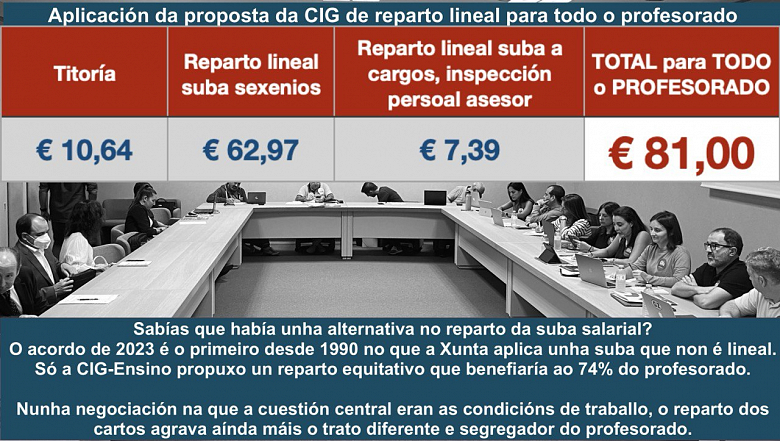 Aínda que para a CIG-Ensino, como xa dixemos en numerosas ocasións, as supostas melloras retributivas neste acordo non foron máis que un intento de comprar vontades e esconder a negativa a outras melloras laborais, fixemos unha proposta que non dividise o profesorado fronte á proposta segregadora da Consellaría que foi aceptada desde o comezo polos demais sindicatos.