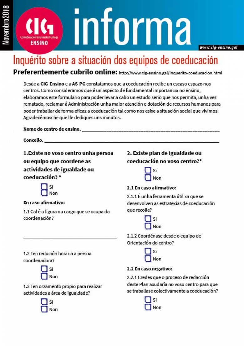 Para a CIG-Ensino e a Asociación Socio-Pedagóxica Galega o traballo en equipo e coordinado en materia de coeducación nos centros de ensino é fundamental para poder reverter a situación social que vivimos e que consideramos que é froito, en boa medida, de non contar cunha educación baseada na igualdade e no respecto ás diferenzas de cada persoa. Precisamente para coñecer de xeito máis real como se artella este traballo nos centros, a CIG-Ensino pon en marcha desde hoxe unha campaña na que recabará información mediante un inquérito, dispoñíbel na nosa páxina web, sobre a existencia de Plans de coeducación, da figura de coordinación destas actividades ou sobre a oferta de materias de libre configuración relacionadas coa igualdade de xénero e a coeducación. Dito inquérito seralle presentado ao profesorado, especialmente aos departamentos de Orientación e ás direccións, durante as visitas que vai realizar este mes aos centros, coincidindo coa conmemoración o 25 de novembro do Día internacional contra a violencia de xénero.