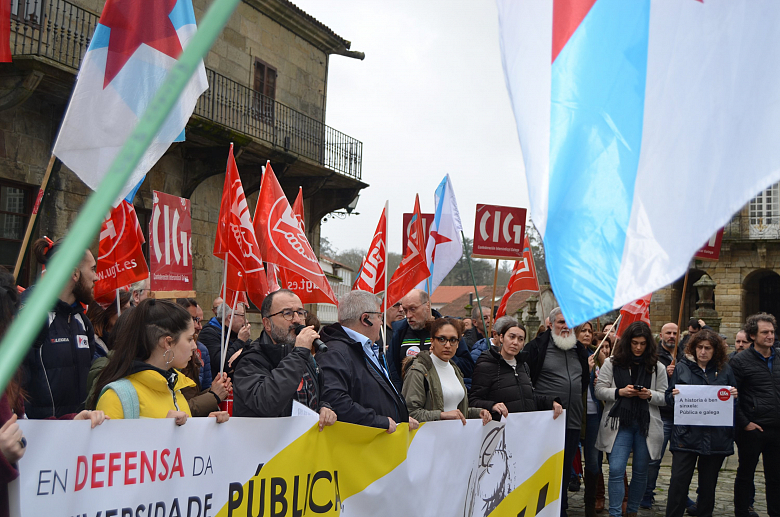 Pola defensa da equidade social nos estudos superiores e contra a privatización da universidade. A Plataforma galega en defensa da universidade pública, da que a CIG-Ensino forma parte, levou a cabo esta mañá o primeiro dos seus actos reivindicativos desde a súa constitución con concentracións fronte a edificios emblemáticos das tres universidades galegas.