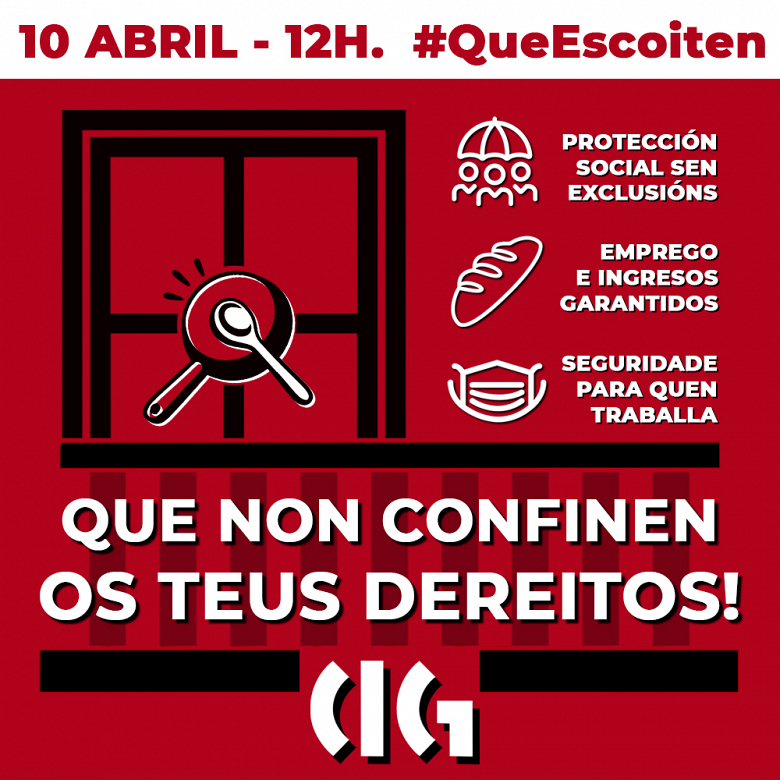 A protesta consistirá nunha cazolada dende as fiestras ás 12 horas do venres 10 de abril "para que se escoiten as nosas demandas e se vexa que aínda que estamos confinados e confinadas non imos calar ante o ataque continuado aos nosos dereitos". O secretario xeral da CIG, Paulo Carril, subliña que hoxe máis que nunca fan falta políticas públicas e concentrar todos os recursos en favor das maiorías sociais, "pero cun financiamento que non parta dos propios traballadores e traballadoras".