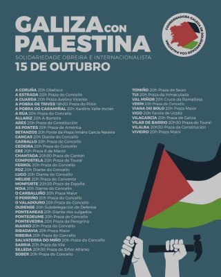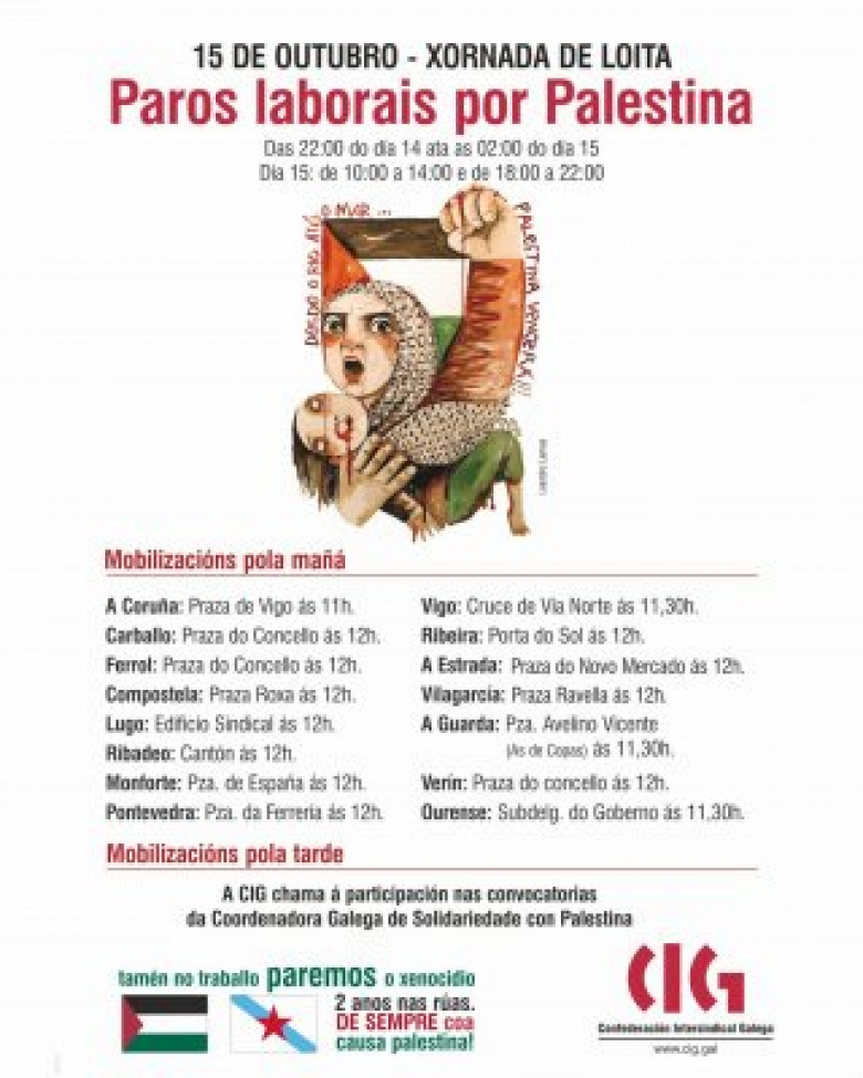No marco da xornada de paro xeral por Palestina do próximo 15 de outubro, a CIG ten convocadas mobilizacións ese día pola mañá en diversas cidades e vilas para visibilizar a solidariedade do pobo galego co pobo palestino, reclamar a fin do xenocidio e da ocupación ilegal e para exixir medidas políticas e económicas reais e efectivas contra o Estado sionista de Israel.