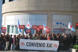Antes de rematar a concentración, representantes dos comités de empresa, xunto co secretario nacional de CIG-Ensino e a secretaria nacional de CIG-Administración, entregaron un escrito dirixido ao Xerente do Consorcio, que está servindo de base para facer unha recollida de sinaturas entre todo o seu persoal, no que se demanda a convocatoria da mesa de Negociación para tratar ademais das mencionadas demandas, a autorización para facer permutas entre as traballadoras e traballadores do organismo, a continuidade do persoal do plan de Inclusión a partir de 2013 e a restauración dos salarios e das pagas extraordinarias completas. o decurso da concentración o secretario nacional da CIG-Ensino, Anxo Louzao, denunciou a situación de precariedade laboral na que se atopan as máis de 1.000 traballadoras e traballadores do Consorcio, con salarios que non chegan nin aos 1.000 euros e aos que se lles aplicaron tamén as reducións nas súas retribucións, incluído o recorte das súas pagas extra. Traballadores e traballadoras que, lembrou carecen mesmo de convenio de referencia.