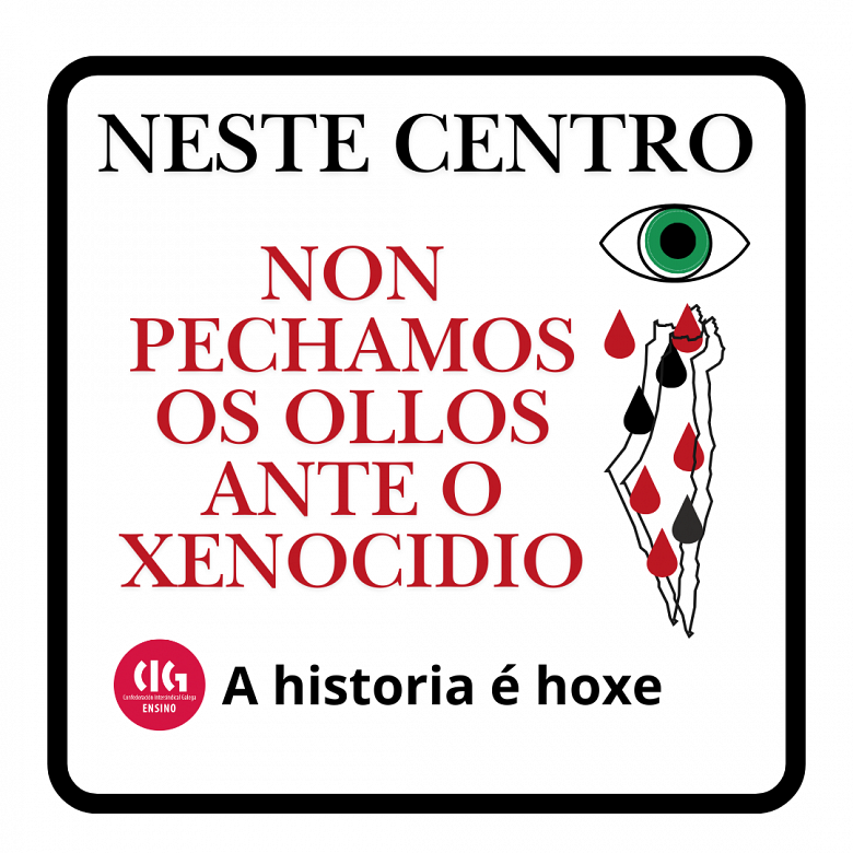 “Neste centro non pechamos os ollos ante o xenocidio. A historia é hoxe”. Este é o lema dunha imaxe que a CIG-Ensino distribúe entre os centros educativos galegos para o seu uso en taboleiros, corredores, portas... e tamén no mundo virtual. O sindicato maioritario no ensino público denunciou desde o primeiro momento que o que estaba acontecendo en Gaza non se trataba dunha guerra ou conflito entre dúas partes, senón que Israel estaba aproveitando para exterminar o pobo palestino e quedarse co seu territorio usando como escusa os atentados de Hamás en outubro de 2023. O tempo lamentabelmente deunos a razón a todas as entidades que condenamos con contundencia os plans do sionismo e do goberno ultra de Netanyahu e nestes intres atopámonos cunha vaga de solidariedade e de presión internacional protagonizada pola poboación civil fronte á complicidade de algúns gobernos e á inoperancia e á indiferencia da maioría.