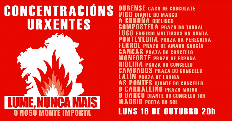 Ás 20 horas están convocadas concentracións de forma simultánea en varias vilas e cidades galegas para amosar a repulsa do pobo galego contra o atentado que supoñen os lumes contra o noso patrimonio natural e socioeconómico e para lembrar que, ademais da acción criminal dos incendiarios, o desleixo ante o abandono do rural e as políticas forestais dos últimos anos contribúen a empeorar esta situación. Tamén desde as organizacións estudantís convocan paros as 12 horas en todas as facultades e IES do País.