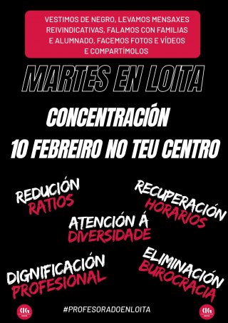 Esta acción reivindicativa comezará a media tarde para facilitar a participación de familias e alumnado e son totalmente flexíbeis na hora de entrada e de saída. Está previsto que sirvan para analizar as demandas conxuntas de toda a comunidade educativa e acordar novas medidas de presión á Consellaría. As organizacións convocantes das mobilizacións no ensino público propoñen tamén que se visibilicen as demandas do profesorado a través dos martes en loita, unha iniciativa na que o profesorado asistirá a clase os martes vestido de negro e explicará a alumnado e familias por que este é máis que un conflito docente. Esta medida terá o seu punto forte o día 10 de febreiro con concentracións nos distintos centros educativos que hai en Galiza.