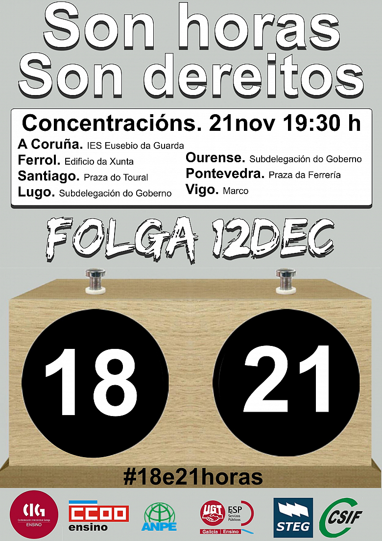 A CIG-Ensino anima a todo o profesorado galego a participar nalgunha das sete concentracións que terán lugar mañá ás 19:30 horas como antesala da xornada de folga no ensino prevista para o día 12 de decembro. Ante a negativa da Consellaría de Educación a negociar a recuperación do horario lectivo que tiñamos antes dos recortes, 18 períodos lectivos semanais en secundaria, FP e ensinanzas de réxime especial e 21 en primaria, infantil e educación especial, só cómpre unha resposta contundente de todo o persoal docente.