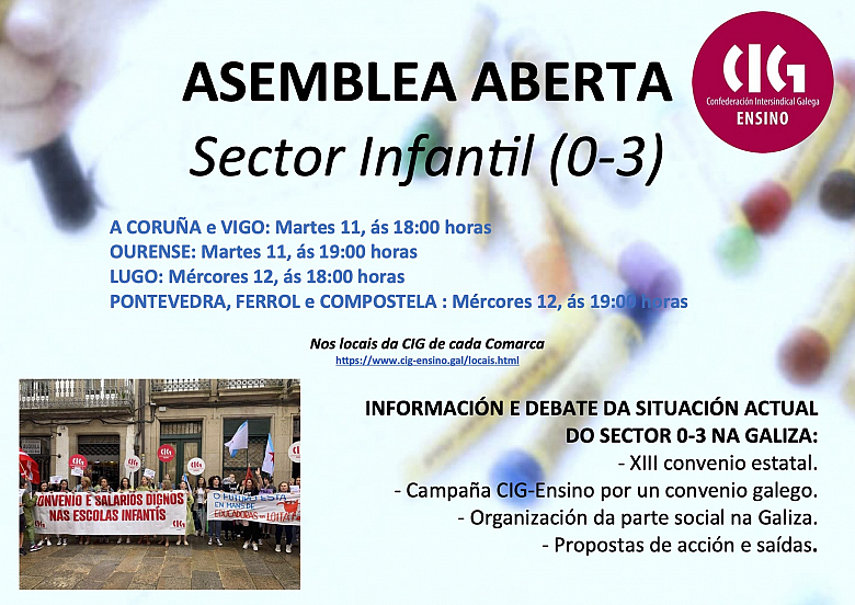 A pasividade e a inacción non pode ser a solución, polo que dende a CIG-Ensino facemos un chamamento a todo o persoal do sector de infantil 0-3 na Galiza para que acoda ás asembleas que se van facer por todo o país e nas sete principais cidades galegas: A Coruña, Vigo, Lugo, Ourense, Pontevedra, Santiago e Ferrol.