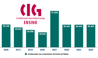Tal e como anunciara a finais de curso, a CIG-Ensino intensifica a súa oposición á política de recortes, privatización, censura e propaganda que caracteriza á Consellaría de Educación, sobre todo desde a etapa de Rueda á fronte da Xunta. “A situación nos centros de ensino é insostíbel. A perda de dereitos foi flagrante nos últimos 16 anos pero desde que rematou a pandemia agudizouse o deterioro das condicións laborais do profesorado e da atención educativa que recibe o alumnado á vez que se incrementaba de xeito obsceno a propaganda da Consellaría”, sinalaba esta mañá Laura Arroxo, secretaria nacional do sindicato maioritario no ensino público galego, nunha comparecencia ante os medios na que estivo acompañada por membros da executiva federal. “Hai datos dos que non dispomos porque Educación non os facilita, como as baixas por saúde mental relacionadas co propio traballo, pero si tendencias claramente constatábeis como o incremento das xubilacións anticipadas, de excedencias voluntarias ou de renuncias a interinidades e a substitucións no ensino que nunca antes se produciran”, indicou, á vez que salientaba: “temos un profesorado literalmente queimado, con ratios que en moitos casos supoñen atender a arredor de 200 estudantes; unha diversidade cada vez maior nas aulas caracterizada por múltiples diagnósticos, protocolos, condutas autolíticas, alumnado migrante recén chegado... que non existía hai unha década; unha burocracia abafante que fai que cada decisión que toma un docente teña que recollerse nun trámite, cando este non se repite 3 ou 4 veces como denuncian os departamentos de Orientación; o peor horario lectivo en secundaria, FP e ensinanzas de réxime especial de todo o Estado; unha privatización cada vez máis feroz centrada sobre todo na Formación Profesional na que as empresas campan ás súas anchas e na que se prevé substituír parte do profesorado por profesionais do sector privado coa creación da figura do docente asociado; unha Consellaría obsesionada coa imaxe e a publicidade, que dedica inxentes recursos cada ano a eventos e asesorías, e tamén por controlar o labor pedagóxico nos centros e censurar todo o que soe a educación nos valores democráticos, pacifistas, ecoloxistas e feministas nos que non cren os seus dirixentes, como se demostrou co mantemento no posto de subdirector xeral da Inspección dunha persoa radicalmente retrógrada”.