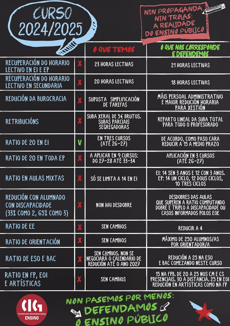 Tal e como xa adiantou o secretario nacional da CIG-Ensino a pasada semana, “a Consellaría de Educación este curso o único que reforzou é a propaganda porque os datos saltan á vista: nin hai 1.256 docentes novos (é simplemente profesorado que aprobou as oposicións pero xa existían esas prazas como interinidades e nin sequera se cubriron todas), nin vai haber 400 novas contratacións (unha parte corresponde ao programa Proa+ que leva varios anos vixente e que se financia con fondos da UE e do Ministerio e outra parte non deixan de ser as prazas, sobre todo de atención á diversidade, que non se lle concederon aos centros como interinidades desde comezos de curso)”. De feito, segundo os datos analizados polo sindicato, este curso houbo 80 interinidades menos de profesorado especialista de Pedagoxía Terapéutica e Audición e Linguaxe que o pasado, así como 30 prazas de atención preferente que non se lle outorgaron aos centros que tiñan alumnado que precisa dunha atención continuada deste tipo de profesionais. Ademais, polo que se sabe até o momento do anunciado Plan Mega (que está composto de 6 programas e algún deles non leva aparellado ningún reforzo de persoal), as únicas prazas que se están contratando para comezar este curso terán como data de finalización o 30 de xuño, é dicir, “a administración aforrarase dous meses de salario precarizando aínda máis a situación deste persoal substituto ao que lle tería correspondido unha interinidade ou mesmo a convocatoria como pesoal fixo por ser prazas estruturais que precisan os centros de forma estable nos seus claustros”.