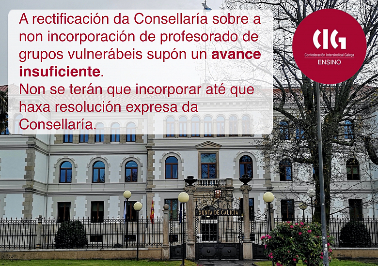 O único cambio que fixo a Consellaría foi a rectificación, despois das críticas da CIG-Ensino e outros sindicatos, no referente á incorporación do profesorado de grupos vulnerábeis mentres non se produce o informe da Inspección Médica, o cal non implica que se o informe é negativo non se vaia obrigar a que se incorpore, polo que a CIG-Ensino amosou a súa desconformidade, xa que entendemos que debe existir un compromiso expreso de que non se van ter que incorporar.