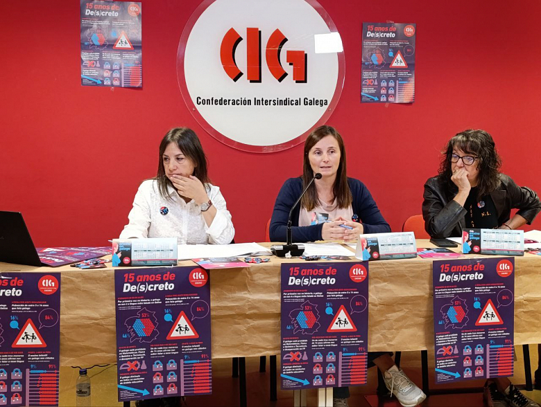 Pola súa banda, Ana Rodiño, docente de Lingua e membro da executiva nacional da CIG-Ensino comentou que ademais da vertente en positivo a campaña conta tamén cunha parte de denuncia. “Mediante un cartaz que leva por título 15 anos de (Des)creto quixemos poñer de manifesto cal é o haber desta normativa no eido do ensino neste período. Para a CIG-Ensino o pouso que queda é que supuxo un total “descreto” para a nosa lingua -de aí o título-, desvalorizándoa, quitándolle prestixio e desterrándoa de moitas etapas educativas nas que nin sequera se mantén un status ritual, como en educación infantil nas cidades ou na Formación Profesional. Os datos están aí. O máis evidente é que por primeira vez na historia o galego é a lingua menos falada no noso país. Os datos do IGE sitúan a porcentaxe de galegofalantes nun 46% fronte a un 53% do castelán e no caso da poboación entre 5 e 14 anos as proporcións sitúanse en que apenas fala galego o 16% fronte ao 84% que se expresa só en castelán ou máis en castelán que en galego. A tendencia ao descenso é brutal dado que baixa a máis da metade con respecto a 2008 en que a porcentaxe de só galego ou máis galego era do 36% nesta franxa de idade. Así pois, isto demostra que a escola actúa como un potente axente desgaleguizador e de novo hai que apuntar ao Decreto de Plurilingüismo. A prohibición de impartir Matemáticas, Física e Química e Tecnoloxía en galego e a falta de materiais didácticos e dunha aposta real pola galeguización en contornas nas que o estudantado é monolingüe en castelán están detrás destes datos”, apuntou. Neste sentido, na campaña ponse de manifesto que o galego só se emprega nun 9% nas aulas de infantil das vilas e cidades con máis de 50.000 habitantes e que, segundo o informe da RAG Prácticas lingüísticas na infancia, publicado no ano 2021 baixa o seu uso en todos os ámbitos (na escrita, como lingua das clases, cos compañeiros e compañeiras e na interacción oral co profesorado).