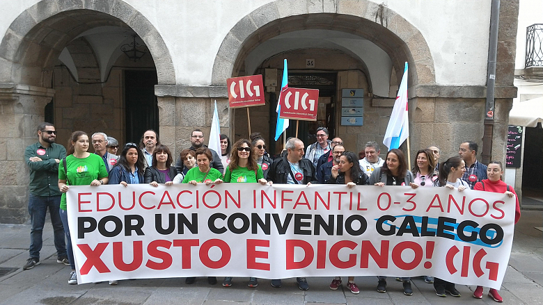 Despois das mobilizacións do 1º de maio no que a CIG-Ensino saíu á rúa, en todas as cidades galegas, denunciando a sinatura do XII Convenio Estatal de Infantil, este martes 21 de maio as delegadas/os das escolas infantís de 0-3 anos volveron saír en Santiago, diante da Confederación de Empresarios de Galiza, demandando a retirada da sinatura, o próximo 22 de maio, do XII Convenio Estatal de Infantil por seguir afondando na precariedade laboral e salarial e por ser rexeitado maioritariamente polas traballadoras/es do sector. Ademais reivindicáronlle á patronal galega abrir negociacións por un Convenio Galego como única vía posible de lograr melloras laborais e salariais que dignifiquen o seu traballo.