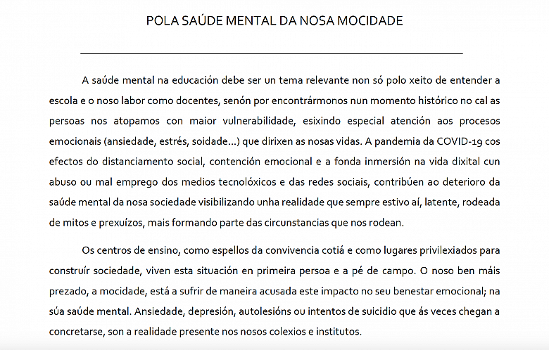 As comunidades educativas dos centros escolares (nomeadamente os institutos de Redondela IES Pedro Floriani, IES Illa de San Simón, IES Mendiño e IES de Chapela) claman por facer visíbel o que tamén denunciamos desde a CIG-Ensino sobre saúde mental porque así se nos traslada desde numerosos centros.