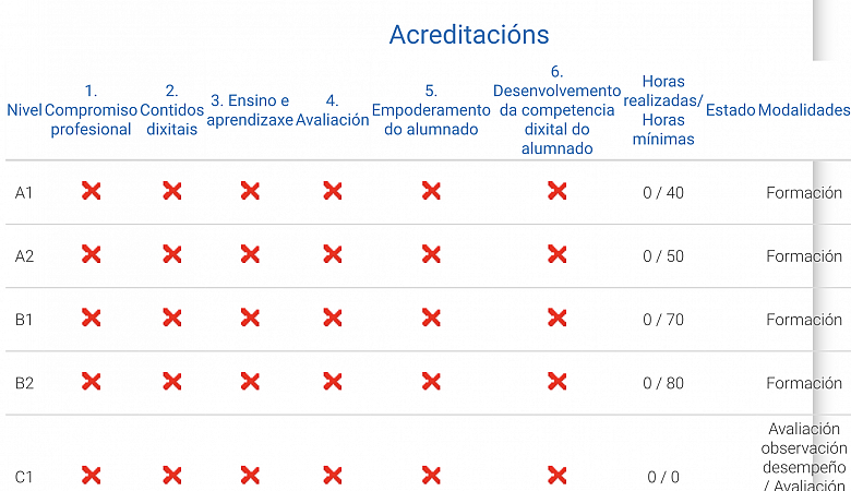 Desde a administración aclaran que non hai un nivel mínimo esixíbel para o profesorado, aínda que a súa intención é que cada docente acredite como mínimo un deles e que, a partir de aí, que o vaia mellorando. Para concretar o estabelecido no marco común e aplicalo a Galiza, vaise elaborar unha Orde que se publicará en breve, posiblemente a finais de marzo, na que se especificará que a acreditación A correspóndese cun nivel básico de posta en práctica, a acreditación B cun nivel avanzado e a C cun nivel correspondente a persoas que investigan, coordinan e innovan dixitalmente. Por parte da CIG-Ensino esixiuse que o contido desta Orde pase pola Mesa Sectorial para que todo o profesorado o coñeza con antelación e poida presentar achegas a través da súa representación sindical.