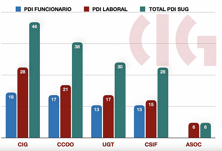 A CIG-Ensino aumenta a súa representación e reforza a condición de primeira forza sindical entre o profesorado universitario. Os resultados das eleccións sindicais do 9 de maio consolidan o apoio electoral do PDI e premian novamente o compromiso dunha acción sindical centrada nunha visión global do sistema universitario galego, nunha liña inquebrantábel de defensa da universidade pública e dos dereitos laborais do seu profesorado e persoal investigador, ao tempo que atende os problemas e conflitos do día a día en cada universidade.