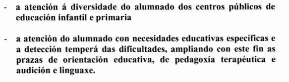 Esta demanda, como indicou Laura Arroxo, vén a completar o recollido no propio Acordo sobre cadros de persoal de infantil e primaria aínda en vigor e que marca como obxectivos da administración educativa os seguintes: