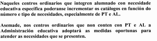 2.- Dotación de especialistas de atención á diversidade noutras ensinanzas e criterios unificados para a fixación dos cupos. Dado que nos próximos meses se van negociar as vacantes definitivas para o vindeiro curso a CIG-Ensino propón tamén incrementar as prazas definitivas de PT nos institutos e crealas nos centros integrados de FP (nos que haxa FP básica polo menos), así como de AL nos institutos. A maiores o sindicato tamén plantexou que, partindo do número de prazas estruturais existentes nos centros, é preciso estabelecer uns criterios para fixar o cupo de profesorado, dado que actualmente existen diferenzas dificilmente xustificábeis entre os mesmos malia contar con características moi semellantes.