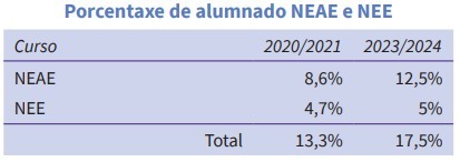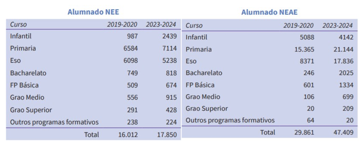 Segundo datos do Ministerio de Educación, Formación Profesional e Deportes, fornecidos pola propia Consellaría de Educación, no curso 23/24, desde infantil até ciclos superiores, había máis de 17.800 matrículas en aulas ordinarias con necesidades educativas especiais e máis de 47.400 con necesidades de apoio educativo. Porén, o incremento deste alumnado (tanto en porcentaxe como en números absolutos) non foi acompañado dun aumento proporcional de recursos humanos, o que está a provocar unha situación límite nos centros. Así, a atención á diversidade depende en gran medida do esforzo persoal do profesorado e non dunha planificación adecuada por parte da Administración.