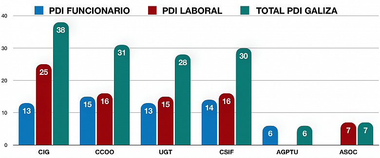 Por universidades, a CIG-Ensino conseguiu 14 delegados e delegadas na USC, distribuídos do seguinte xeito: 5 entre o PDI funcionario, 7 entre o PDI laboral do campus de Santiago e 2 entre os/as laborais do campus de Lugo. Pola súa banda, na Universidade de Vigo a CIG renova a súa condición de sindicato máis votado, sendo 13 os representantes electos, neste caso repartidos entre 5 do colectivo de PDI funcionario, outros 5 entre o PDI laboral dos campus de Vigo e de Pontevedra e 3 laborais do campus de Ourense. Por último, na Universidade da Coruña os resultados tamén foron moi positivos ao obter 11 delegados e delegadas dun total de 38 que se elixían. Neste caso 3 corresponden a PDI funcionario e 8 a PDI laboral, colectivo este último no que por vez primeira a CIG gaña as eleccións sindicais na institución herculina.