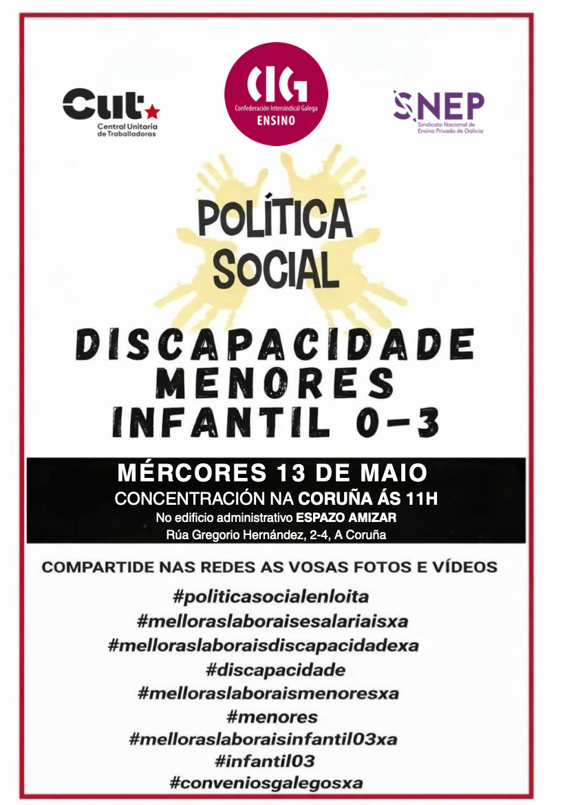 - Unha CONCENTRACIÓN o mércores 13 de maio ás 11:00 horas na Coruña diante do Edificio administrativo de Política Social ESPAZO AMIZAR, situado na rúa Gregorio Hernández, 2-4.