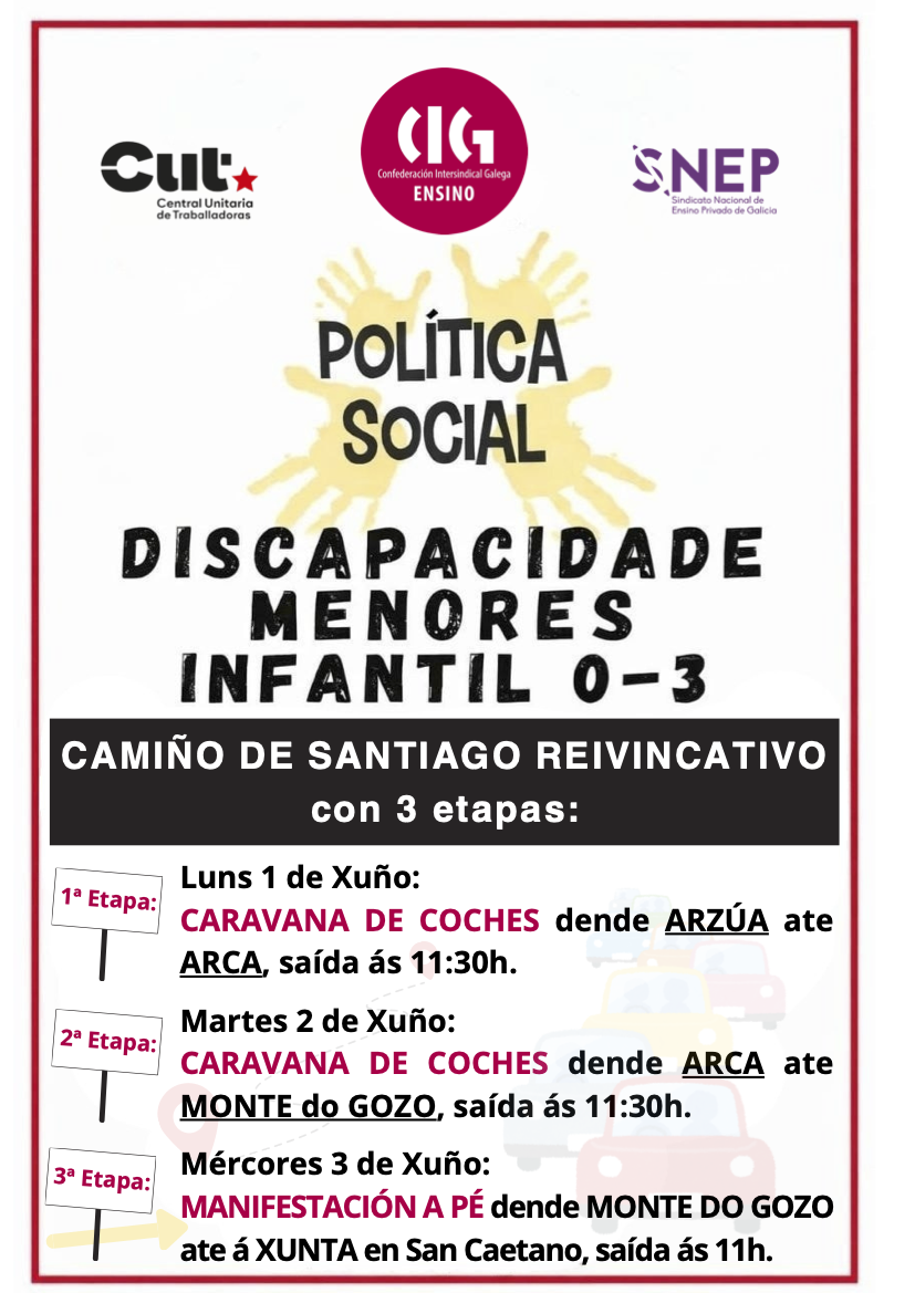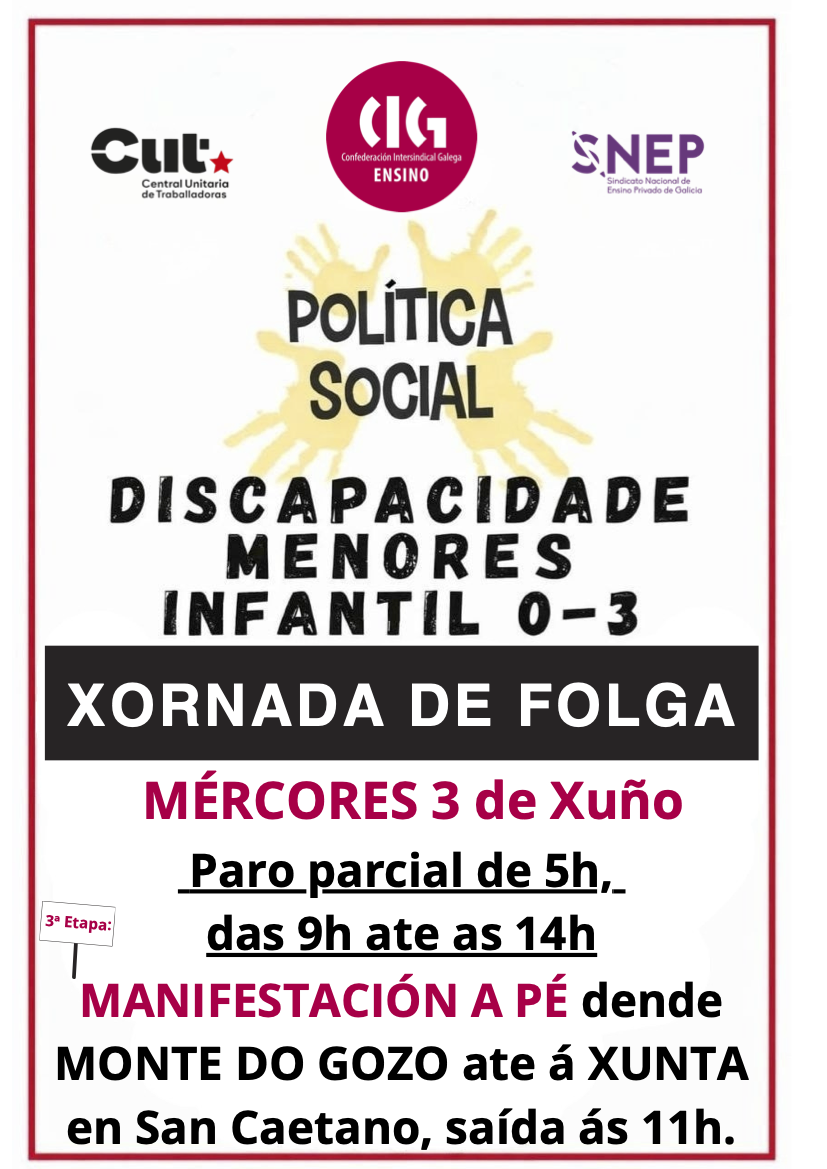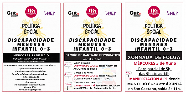 As tres organizacións sindicais, CIG - CUT - SNEP, que levamos camiño dun ano loitando e mobilizando os 3 sectores cun mesmo fin: “Melloras laborais, sociais e salariais: convenios dignos e xustos”, así como baixada das ratios, xornadas xustas, máis recursos, mellores instalacións..., facemos unha chamada pública de unidade de acción reivindicativa nas rúas galegas, organizada por todas as entidades sociais, organizacións, plataformas, e asociacións que aposten polas mobilizacións e a folga, tendo claro que a loita é o único camiño e miren polo interese colectivo e non polo propio. E, por suposto, dirixida á Xunta de Galicia, concretamente á Consellaría de Política Social, que é quen ten todas as competencias e o poder de modificar a mesma situación de precariedade que sofren estes 3 sectores.