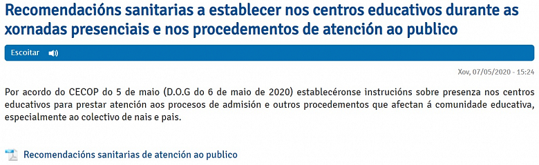 O día seguinte ao rexistro da nosa solicitude a Consellaría fai público un documento baixo o título de “Recomendacións sanitarias a establecer nos centros educativos durante as xornadas presenciais e nos procedementos de atención ao publico”. Este proceder por parte da Consellaría é inaceptábel polos seguintes motivos: