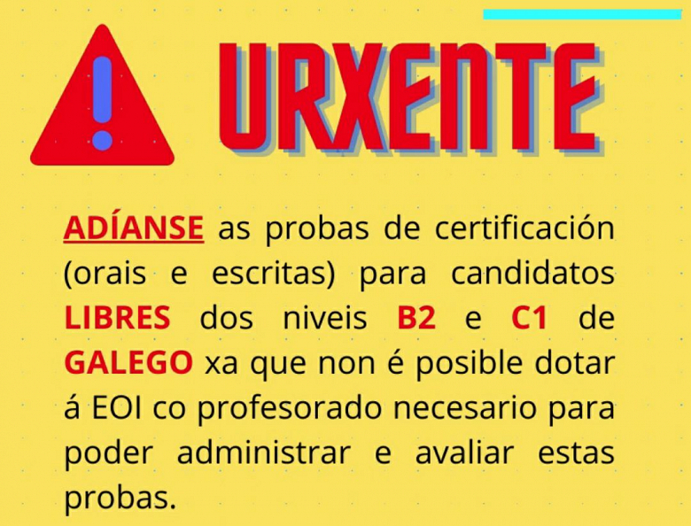 A Consellaría non asumiu as súas funcións ao non dotar de profesorado de reforzo os departamentos de galego para que poidesen avaliar os exames libres que ían ter lugar neste mes. Isto obrigou a cancelar as probas libres dos niveis B2 e C1 en todas as Escolas. Ademais, nunha nota informativa enviada onte pola tarde ás EOI, a Consellaría pídelles que continúen coas probas que poidan (o "ti vai facendo" ao que sempre se agarra a Consellería dende o comezo da crise provocada pola Covid-19), algo que vai en contra das súas propias instrucións que indican que as probas deben ser unificadas para toda Galicia e, polo tanto, realizarse ao mesmo tempo.
