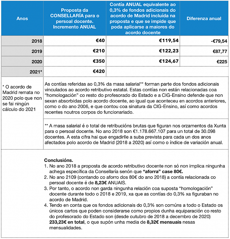 No acordo asinado polo goberno do PP e os sindicatos estatais establecíase que as diferentes administracións poderían aprobar subas salariais para o seu persoal dun 0,3% da masa salarial total nos anos 2018, 2019 e 2020. A CIG-Ensino xa rexeitou rotundamente esta imposición centralistas e agora critica á Consellaría por converter nunha fraude a negociación de retribucións docentes. De feito, coa suba de 10 euros de outubro a decembro deste ano, a Xunta aforraríase case 80 euros por docente só no ano 2018.