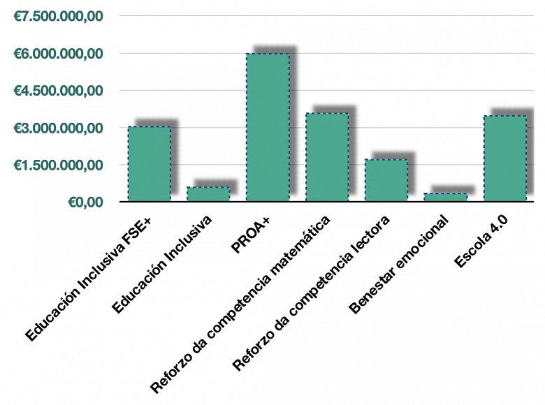 O Ministerio de Educación e as CCAA pactaron na Conferencia Sectorial de Educación o reparto duns importantes fondos destinados a unha serie de programas nos que ten especial protagonismo a atención á diversidade e a educación inclusiva. Do total deses fondos Galiza recibe máis de 18 millóns de euros. Unha parte importante (preto de 6 millóns de euros) corresponde ao Proa+, programa que xa se vén realizando nos últimos anos e que non supón ningunha novidade, polo que é unha manipulación máis que o conselleiro o inclúa no famoso Plan MEGA. O resto son actuacións financiadas fundamentalmente con fondos europeos e dos que a Consellaría non deu detalles nin de como se están a investir nin de cando empezará a contratación do persoal de reforzo, que vai con retraso porque a maioría ten vixencia desde o 1 de setembro.