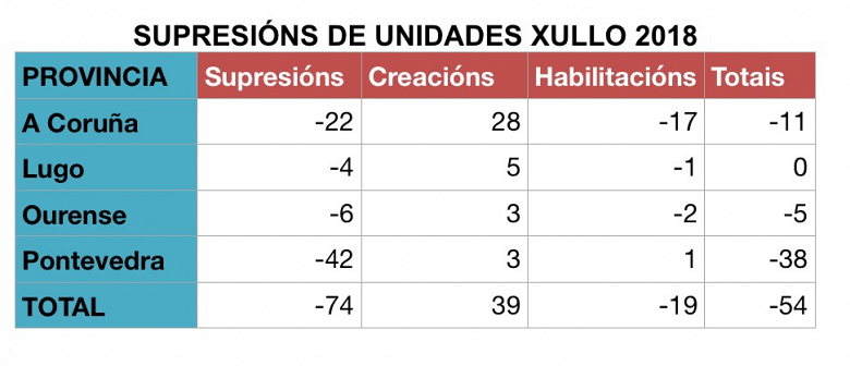 A supresión de unidades educativas afecta especialmente ás provincias da Coruña e Pontevedra, nas que se pechan tanto aulas creadas oficialmente e que, por tanto, figuraban nos catálogos a efectos da súa cobertura con docentes definitivos como aulas habilitadas (aquelas que se abriron nos últimos anos e que agora se pechan sen que nunca foran cubertas definitivamente).
