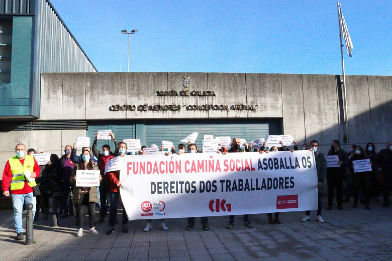 Traballadores e traballadoras do Centro de Menores Concepción Arenal e do CIEMA, xestionados pola Fundación Camiña Social, concentráronse este xoves diante do seu centro pola recuperación do poder adquisitivo dos seus salarios, na defensa do convenio colectivo propio e pola mellora do servizo que se presta aos menores. Denuncian que Camiña Social, malia ter un superávit de preto de seis millóns de euros nas súas contas, mantenlles conxelados os salarios desde 2014, ano no que caducou o convenio, escusándose nuns supostos balances económicos negativos dos últimos tres anos.
