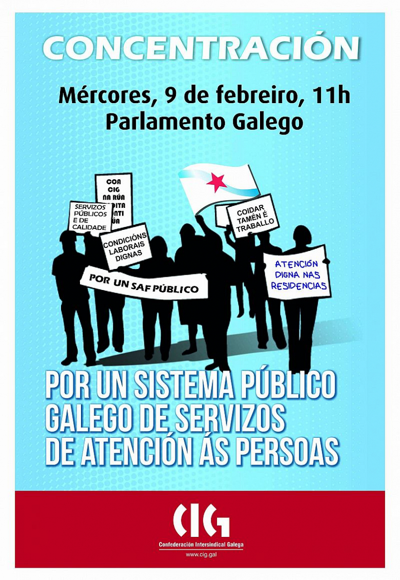 O Pleno do Parlamento Galego debaterá e votará a vindeira semana a Proposta Non de Lei de Iniciativa Popular promovida pola CIG pola que se insta á Xunta de Galiza á creación dun sistema público galego de atención ás persoas. Con tal motivo, a central nacionalista vai realizar unha concentración diante do Pazo do Hórreo, o mércores día 9 de febreiro, ás 11 horas, para visibilizar a necesidade de pór os coidados no centros políticas públicas, que se deixen de mercantilizar e que se dignifiquen as condicións laborais.