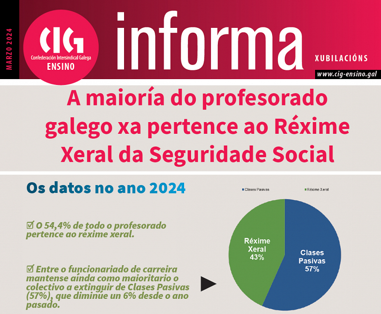 Tal e como se pode ver no CIG-Informa monográfico sobre este asunto, tan só no funcionariado de carreira se mantén a proporción superior no colectivo de clases pasivas cun 57% fronte ao 43% da Seguridade Social.