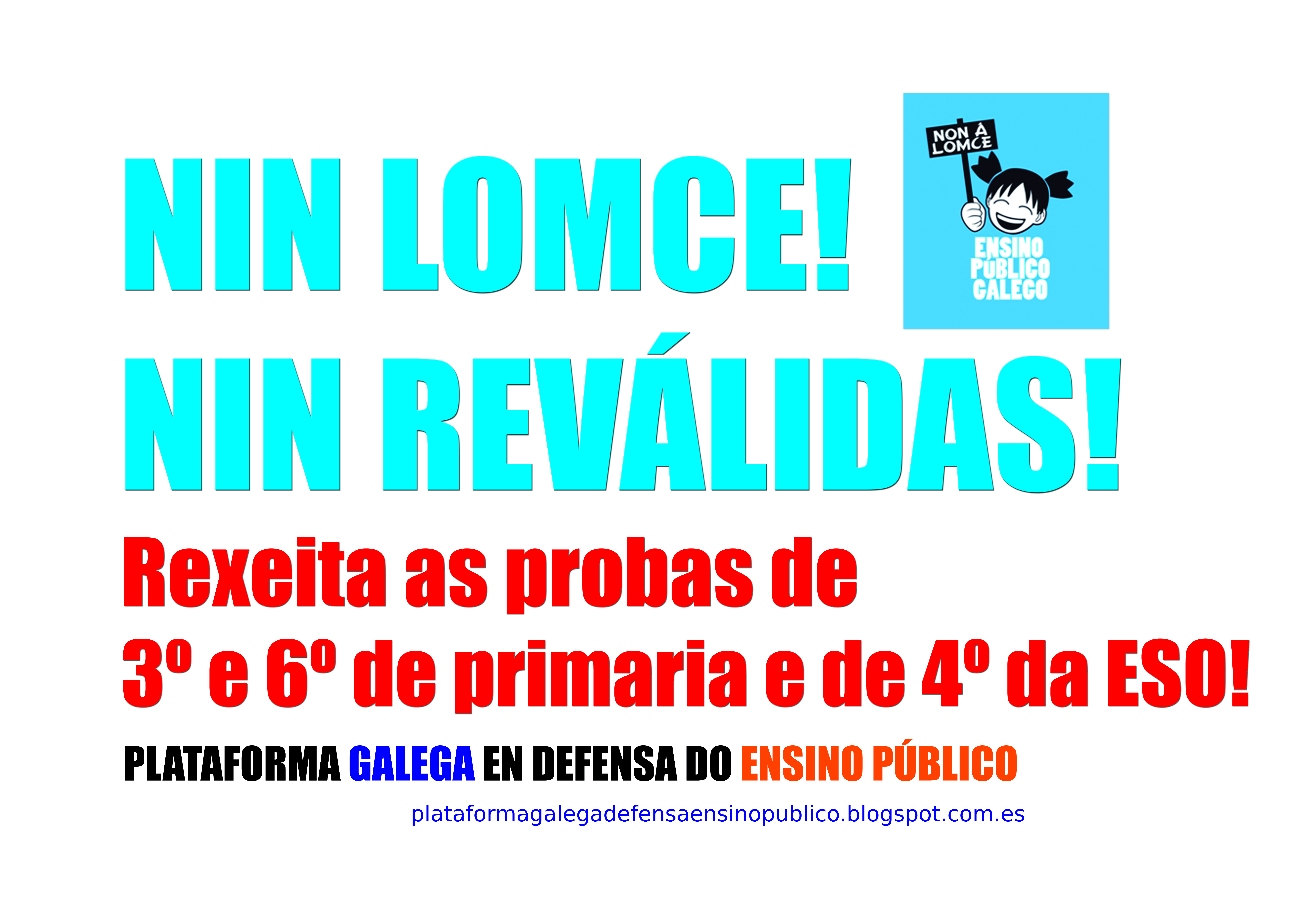 Coincidindo co inicio das probas xerais de 6º de Primaria e de 4º da ESO, a Plataforma Galega en Defensa do Ensino Público convoca a todos os medios de comunicación a un acto simbólico que realizará mañá MARTES 23 DE MAIO ÁS 11:15 HORAS, diante da Consellaría de Educación, en Santiago. Neste acto someterase ao conselleiro de Educación á realización da reválida.
