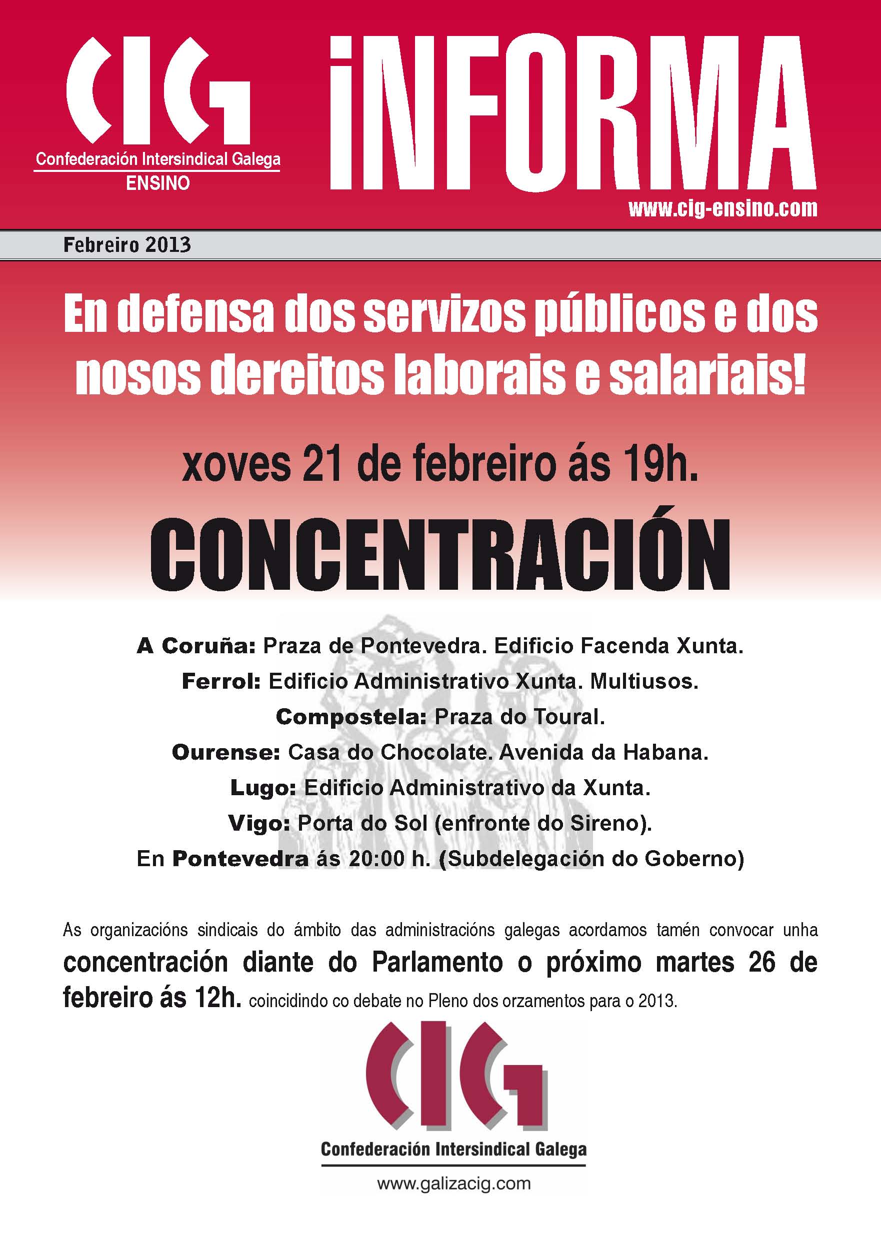 Así mesmo, coincidindo coa data de votación dos Orzamentos da Xunta para 2013, a Plataforma ten convocada unha concentración o vindeiro martes 26 de febreiro, dende ás 12:00 horas, ás portas do Pazo do Hórreo.