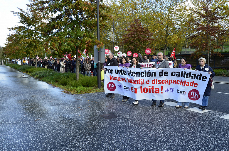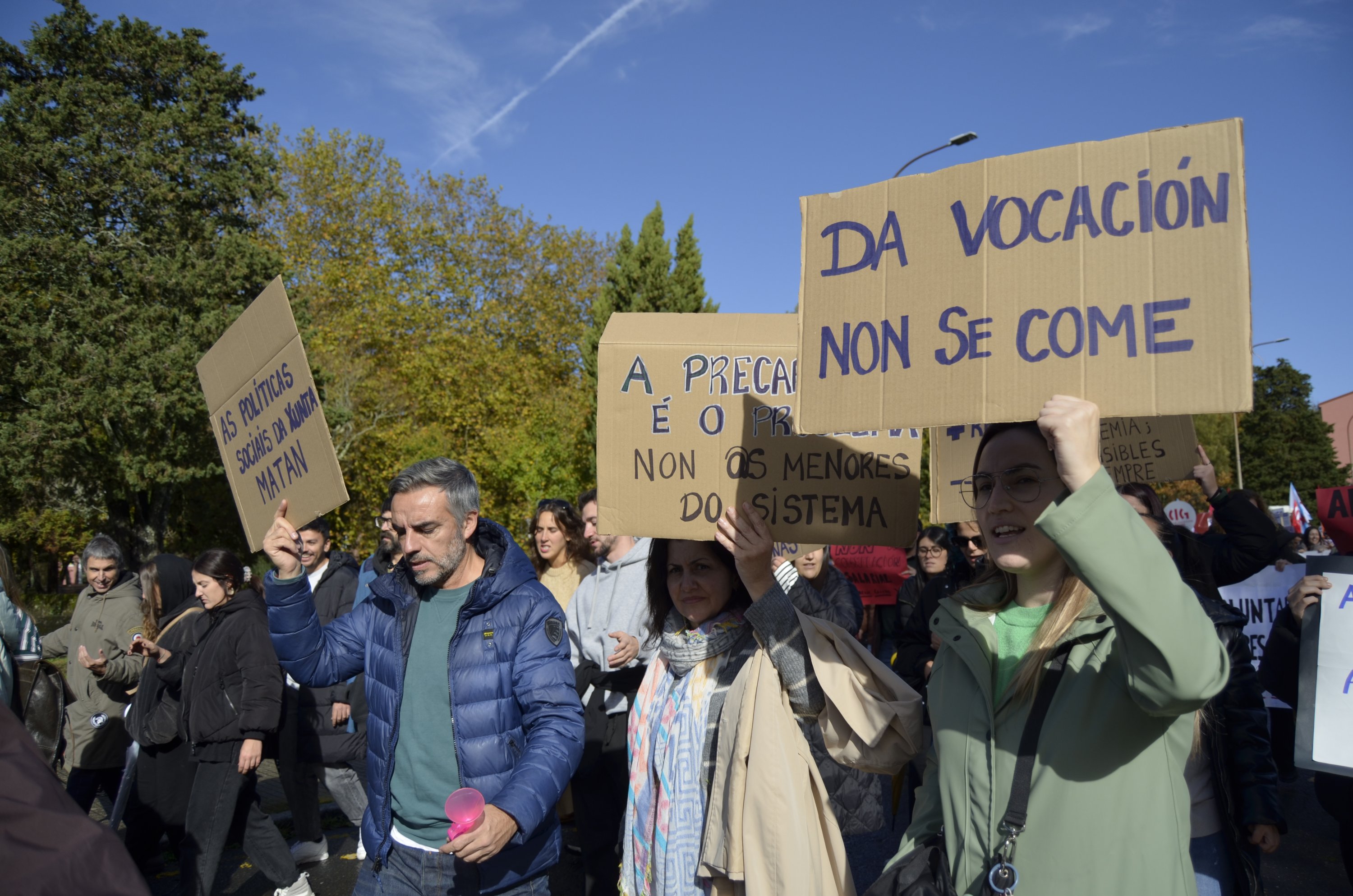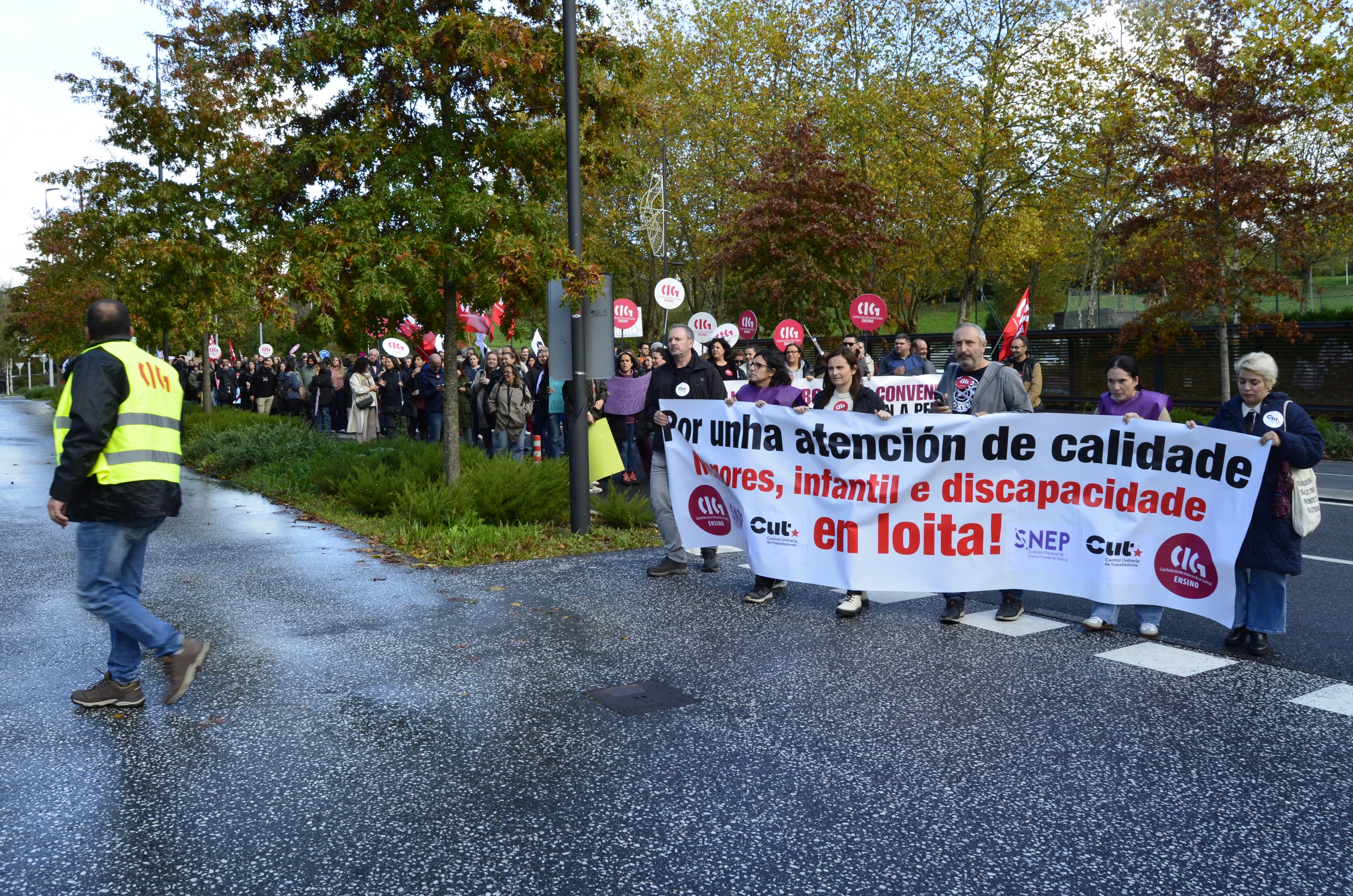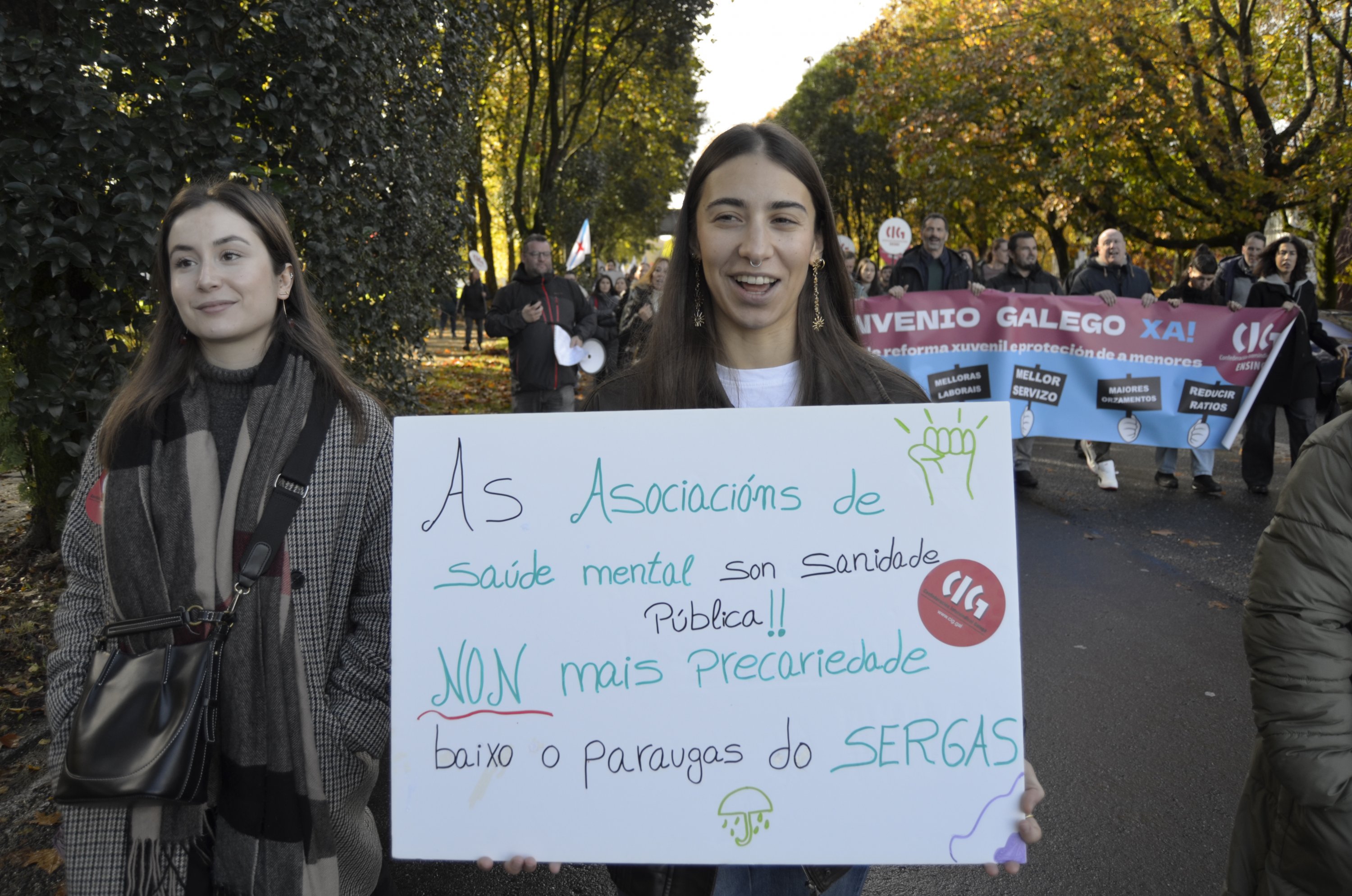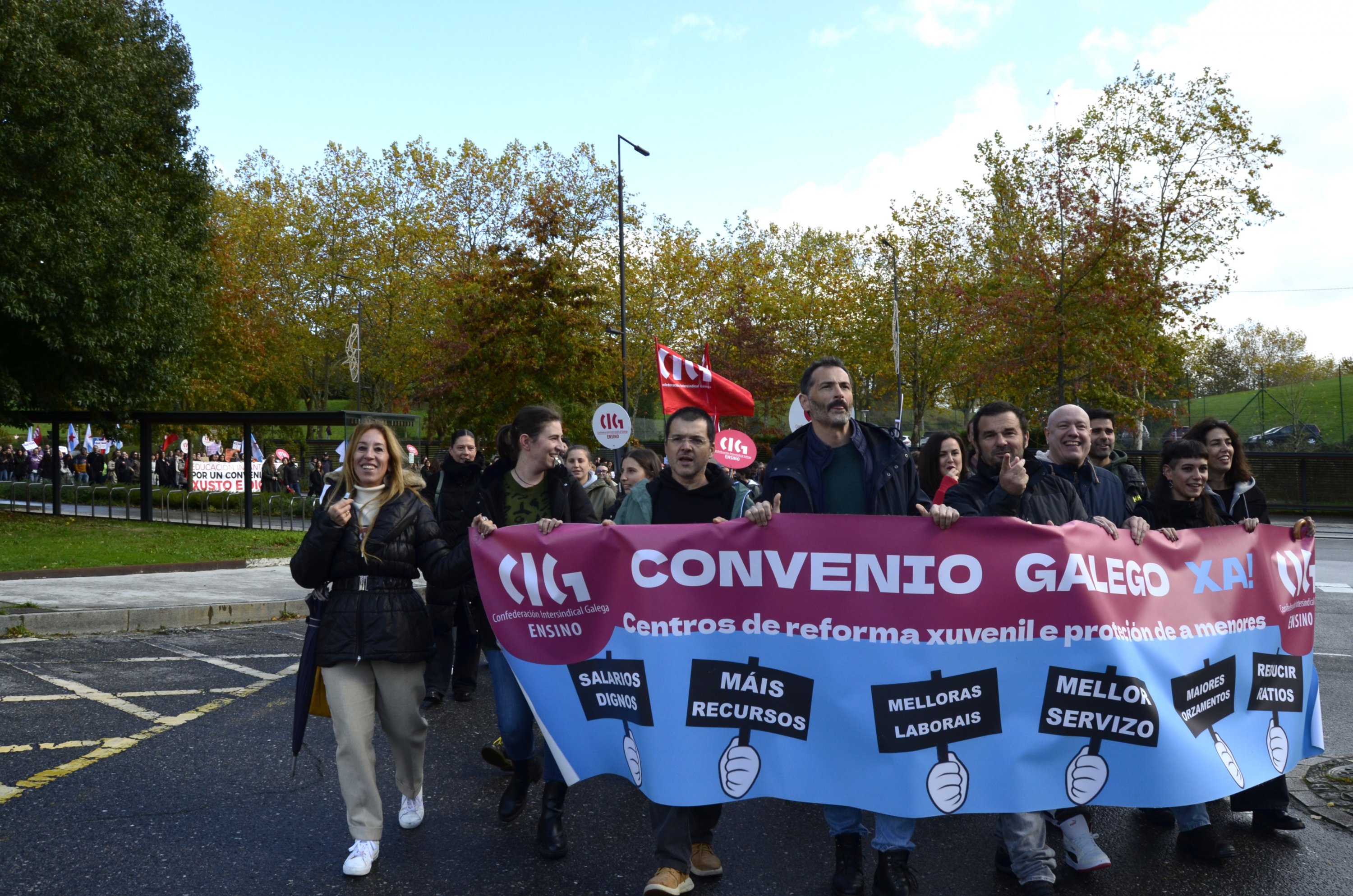 A marcha, na que se estima unha participación superior ao milleiro de persoas, rodeou o edificio administrativo de San Caetano e transcorreu baixo consignas como “traballo feminizado, traballo precarizado”, “convenio galego, salarios dignos” ou “menos discursos e máis recursos” en alusión esta última á conselleira de Política Social que ten as competencias para xestionar estes tres servizos, a maioría deles xestionados por asociacións sen ánimo de lucro en réxime de concerto social. Neste sentido, Germán Estévez, presidente do comité de empresa de Monteledo, un dos dous grandes centros residenciais de Ourense dedicados á reforma xuvenil e a medidas terapéuticas para menores en situacións complexas, indicou que “precisamente o que pedimos é que se nos trate como un servizo público concertado e non coa situación de precariedade tanto salarial e laboral que temos actualmente, con soldos nalgúns casos rozando o SMI, conxelados nos últimos anos, sen pluses de nocturnidade e perigosidade, sen revisar á baixa a ratio de menores por educador/a nin vixiar que se cumpran as estabelecidas, sen a cobertura do persoal de baixa e con moitas dificultades para atopar persoal tanto de forma temporal como permanente. Está pasando que moitas educadoras e e educadores sociais pasan por estes centros só como unha vía intermedia mentres non atopan un traballo mellor... Ademais, a nosa realidade é moi diversa porque hai moitos centros pequenos dedicados á protección de menores en situación de vulnerabilidade, pisos tutelados, casas de acollida, puntos de encontro familiar... que teñen problemáticas particulares que non están a ser atendidas, aínda que as condicións que rexe o convenio estatal nos marquen uns parámetros iguais para todos e todas”.