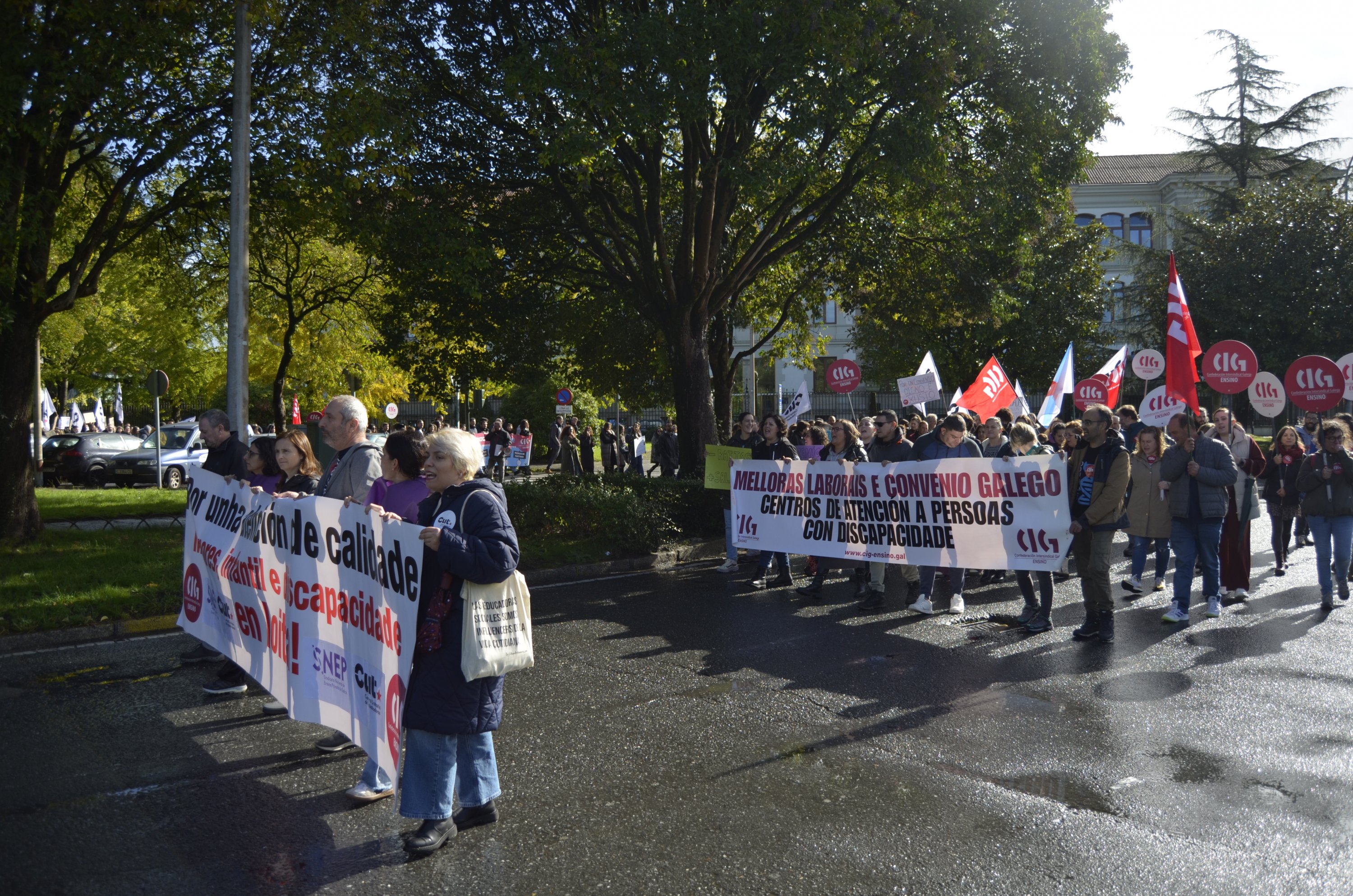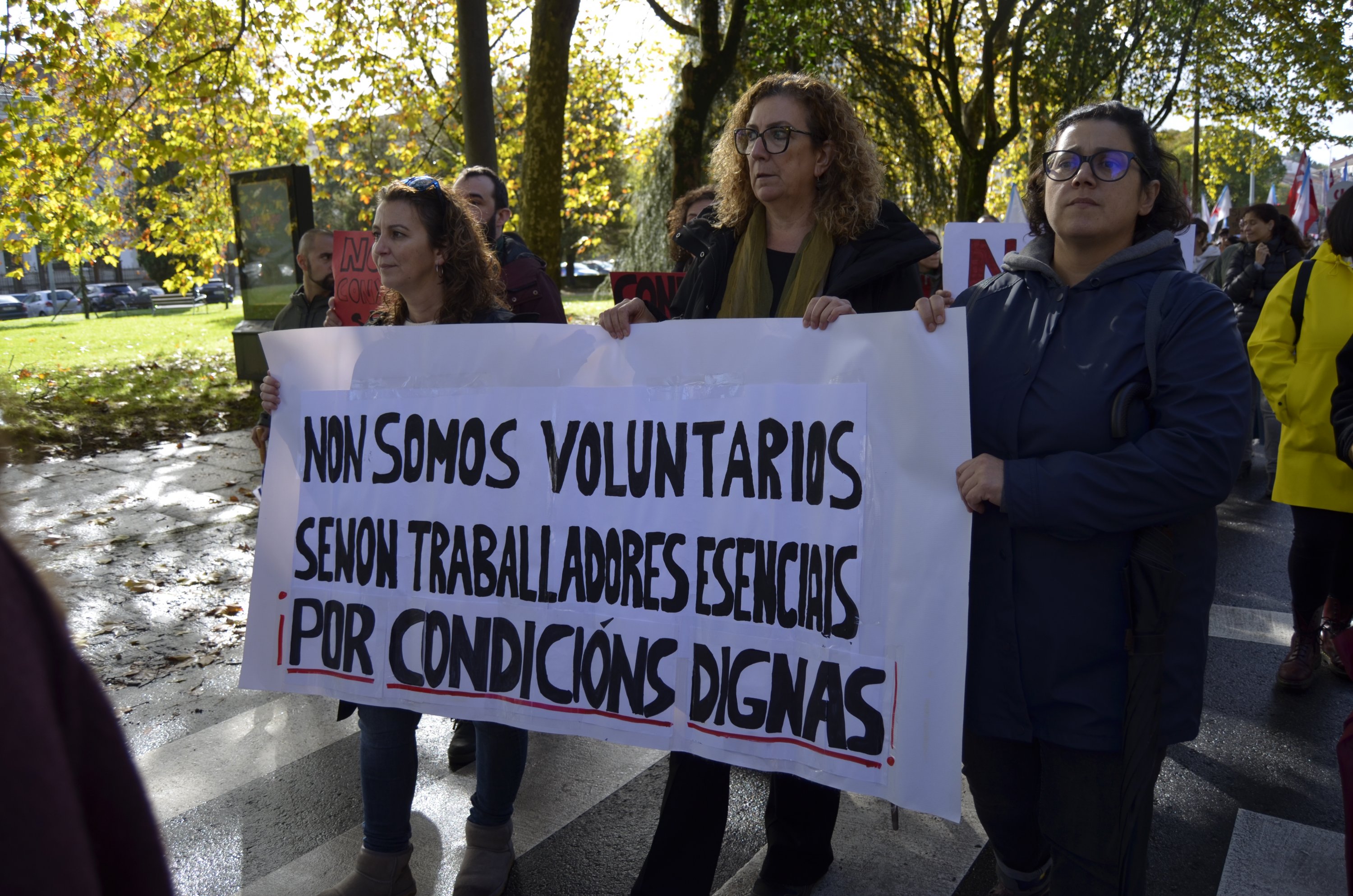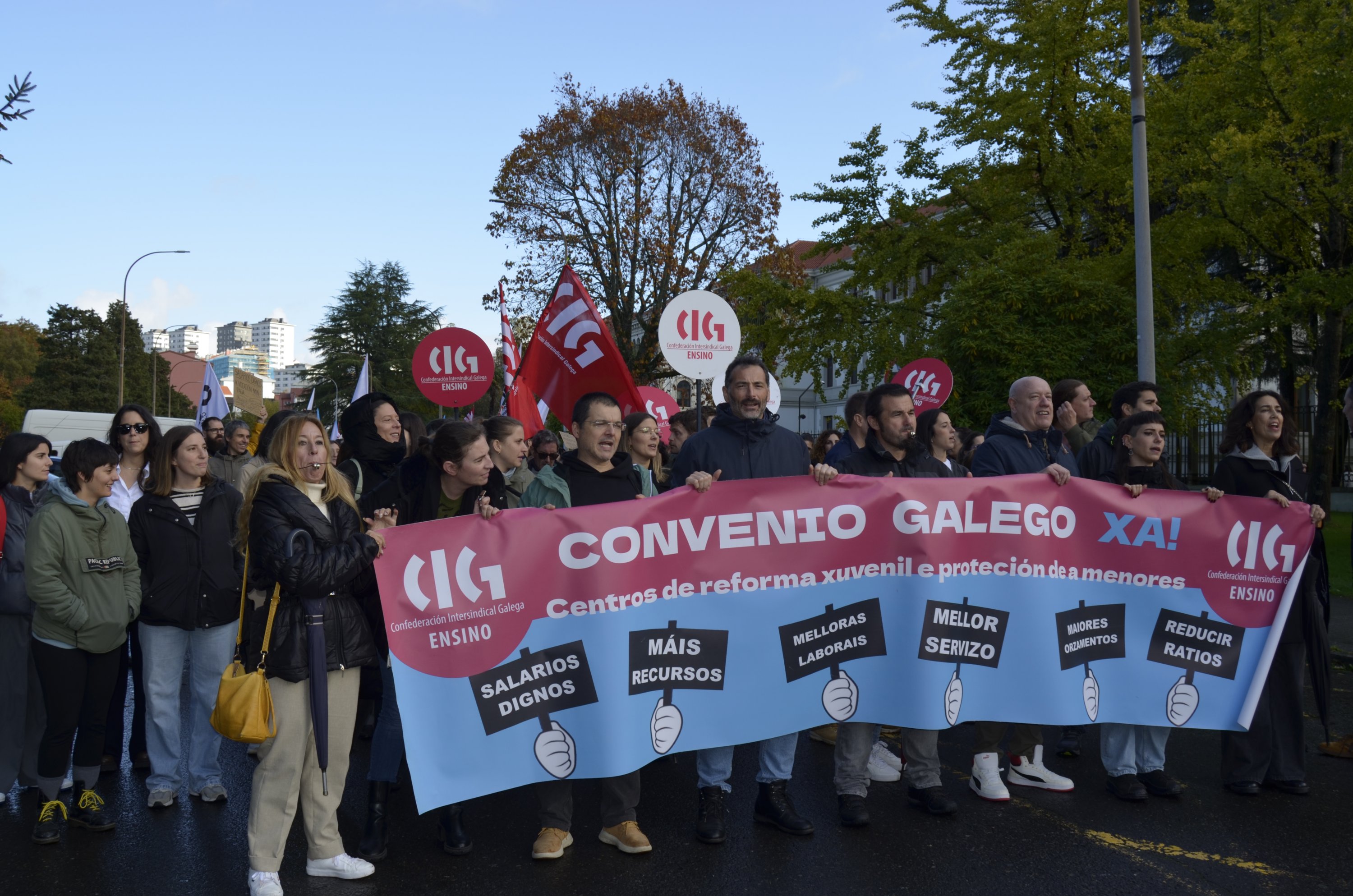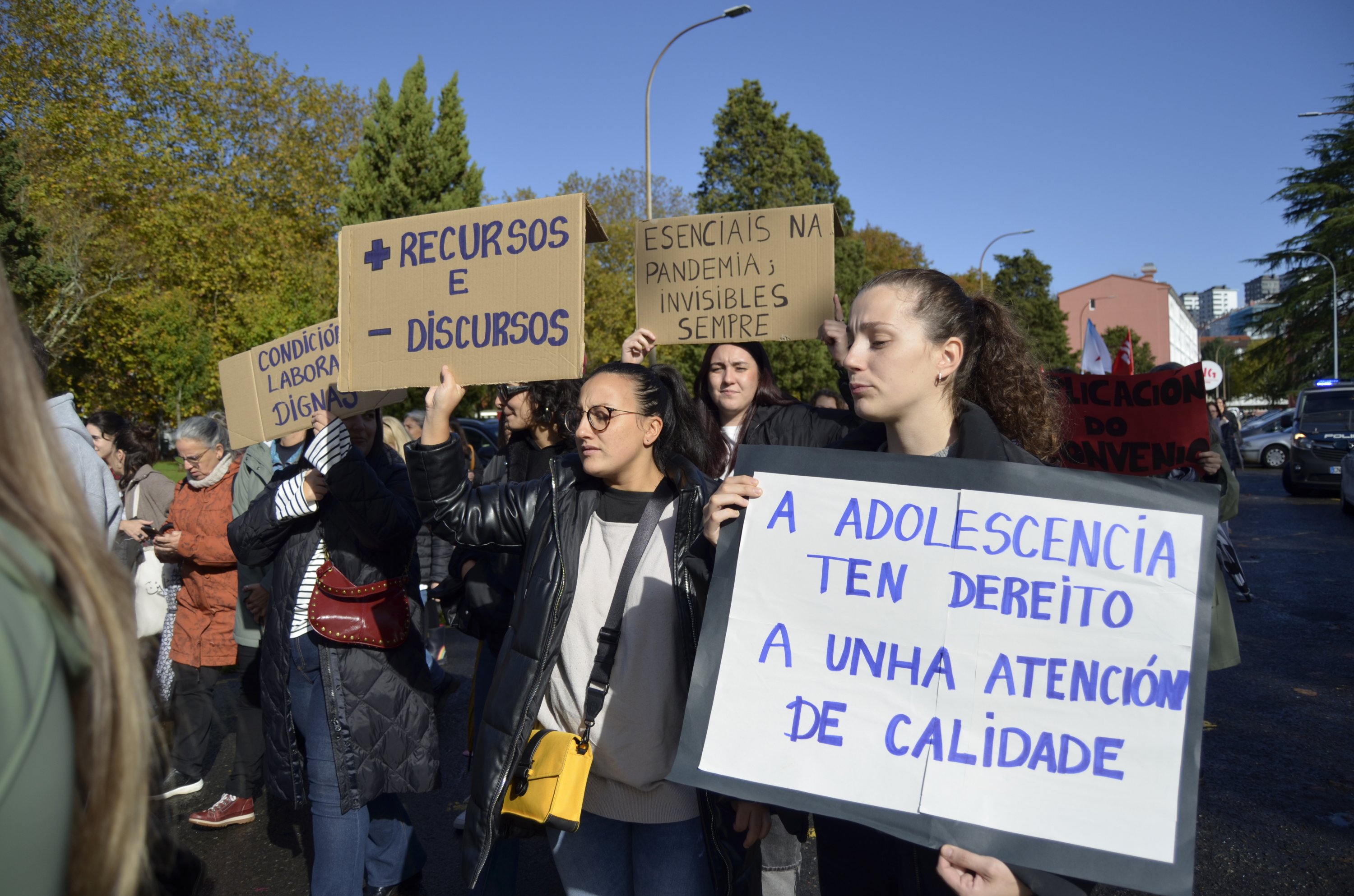 A marcha, na que se estima unha participación superior ao milleiro de persoas, rodeou o edificio administrativo de San Caetano e transcorreu baixo consignas como “traballo feminizado, traballo precarizado”, “convenio galego, salarios dignos” ou “menos discursos e máis recursos” en alusión esta última á conselleira de Política Social que ten as competencias para xestionar estes tres servizos, a maioría deles xestionados por asociacións sen ánimo de lucro en réxime de concerto social. Neste sentido, Germán Estévez, presidente do comité de empresa de Monteledo, un dos dous grandes centros residenciais de Ourense dedicados á reforma xuvenil e a medidas terapéuticas para menores en situacións complexas, indicou que “precisamente o que pedimos é que se nos trate como un servizo público concertado e non coa situación de precariedade tanto salarial e laboral que temos actualmente, con soldos nalgúns casos rozando o SMI, conxelados nos últimos anos, sen pluses de nocturnidade e perigosidade, sen revisar á baixa a ratio de menores por educador/a nin vixiar que se cumpran as estabelecidas, sen a cobertura do persoal de baixa e con moitas dificultades para atopar persoal tanto de forma temporal como permanente. Está pasando que moitas educadoras e e educadores sociais pasan por estes centros só como unha vía intermedia mentres non atopan un traballo mellor... Ademais, a nosa realidade é moi diversa porque hai moitos centros pequenos dedicados á protección de menores en situación de vulnerabilidade, pisos tutelados, casas de acollida, puntos de encontro familiar... que teñen problemáticas particulares que non están a ser atendidas, aínda que as condicións que rexe o convenio estatal nos marquen uns parámetros iguais para todos e todas”.