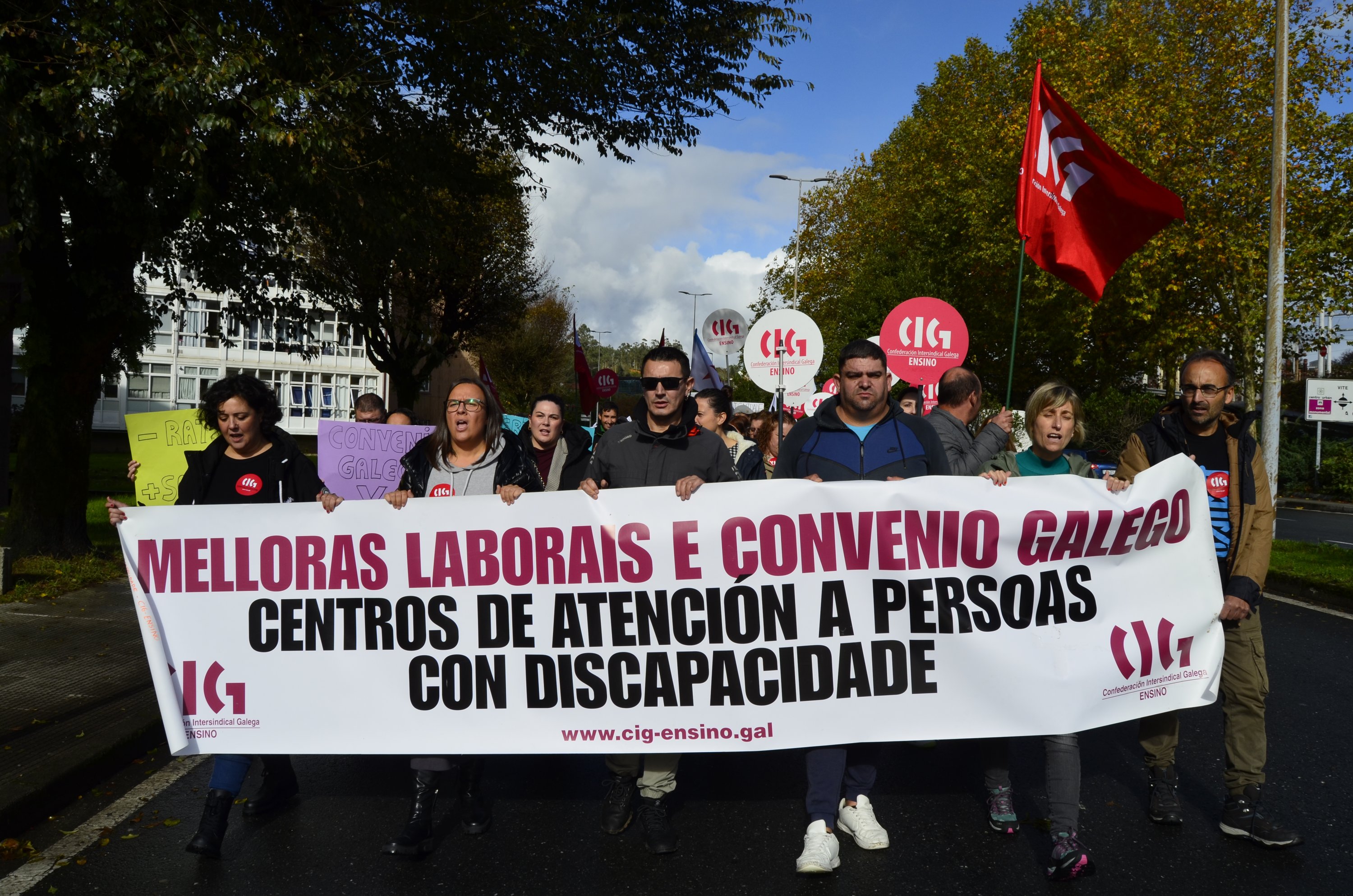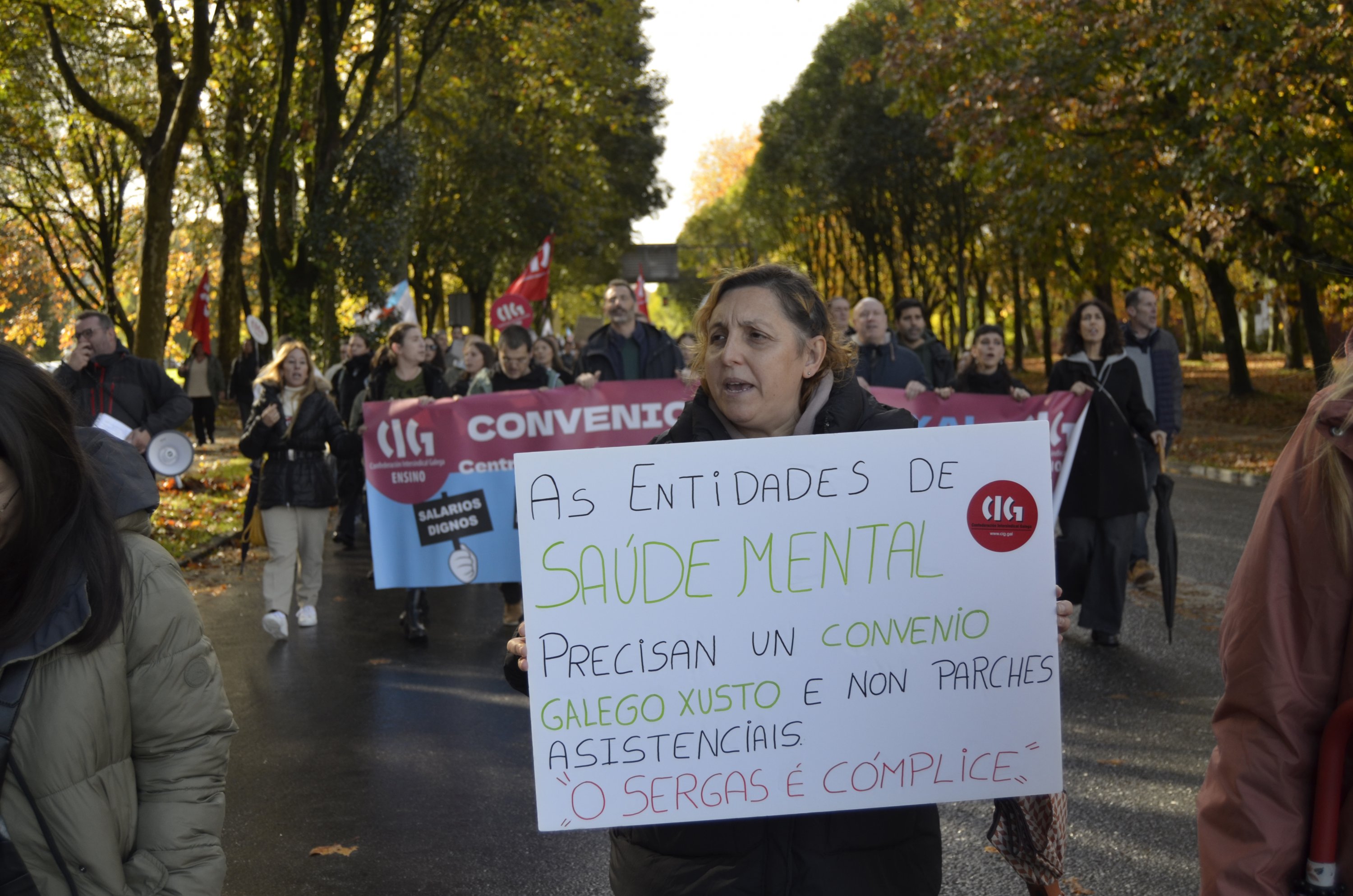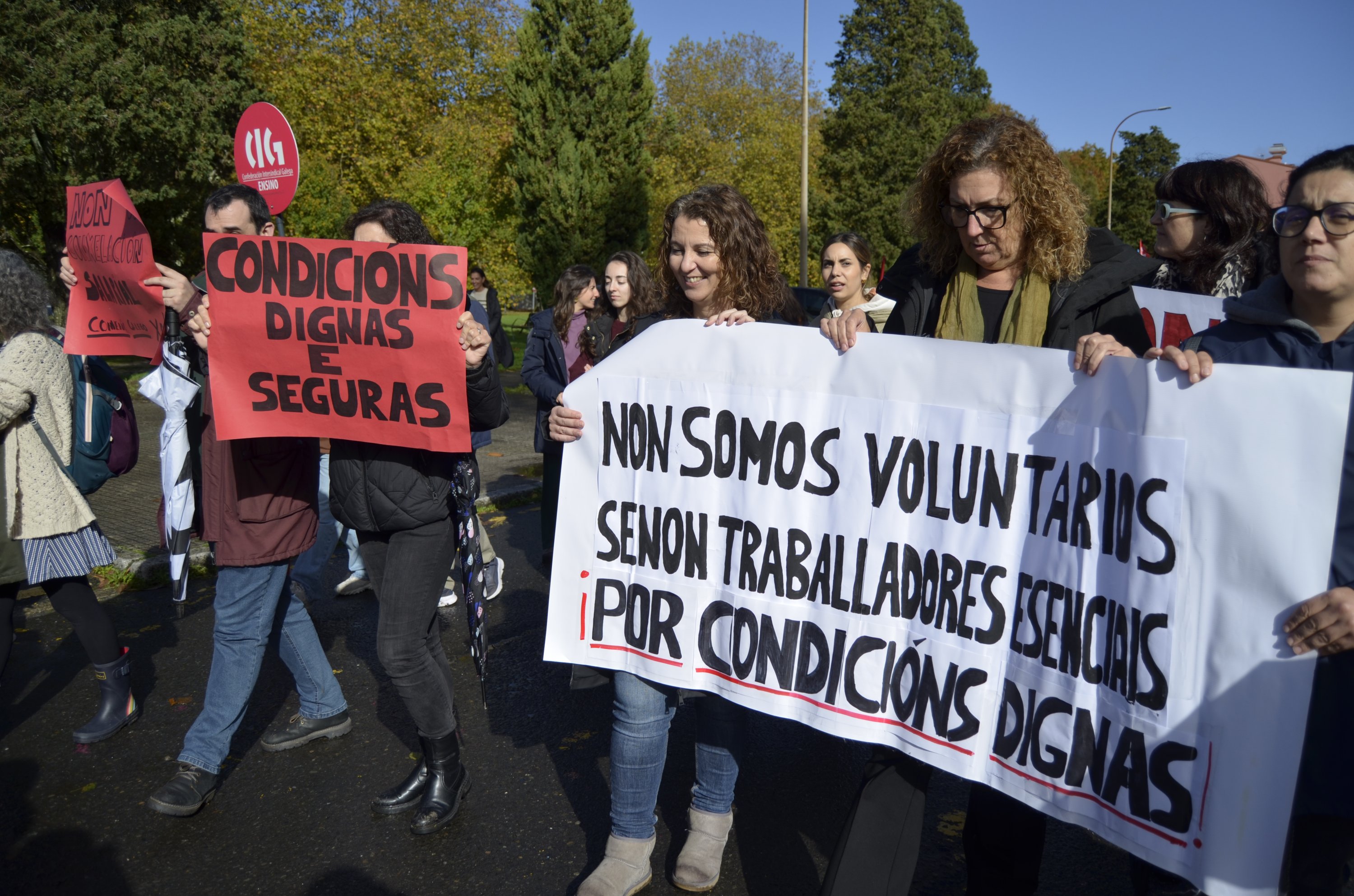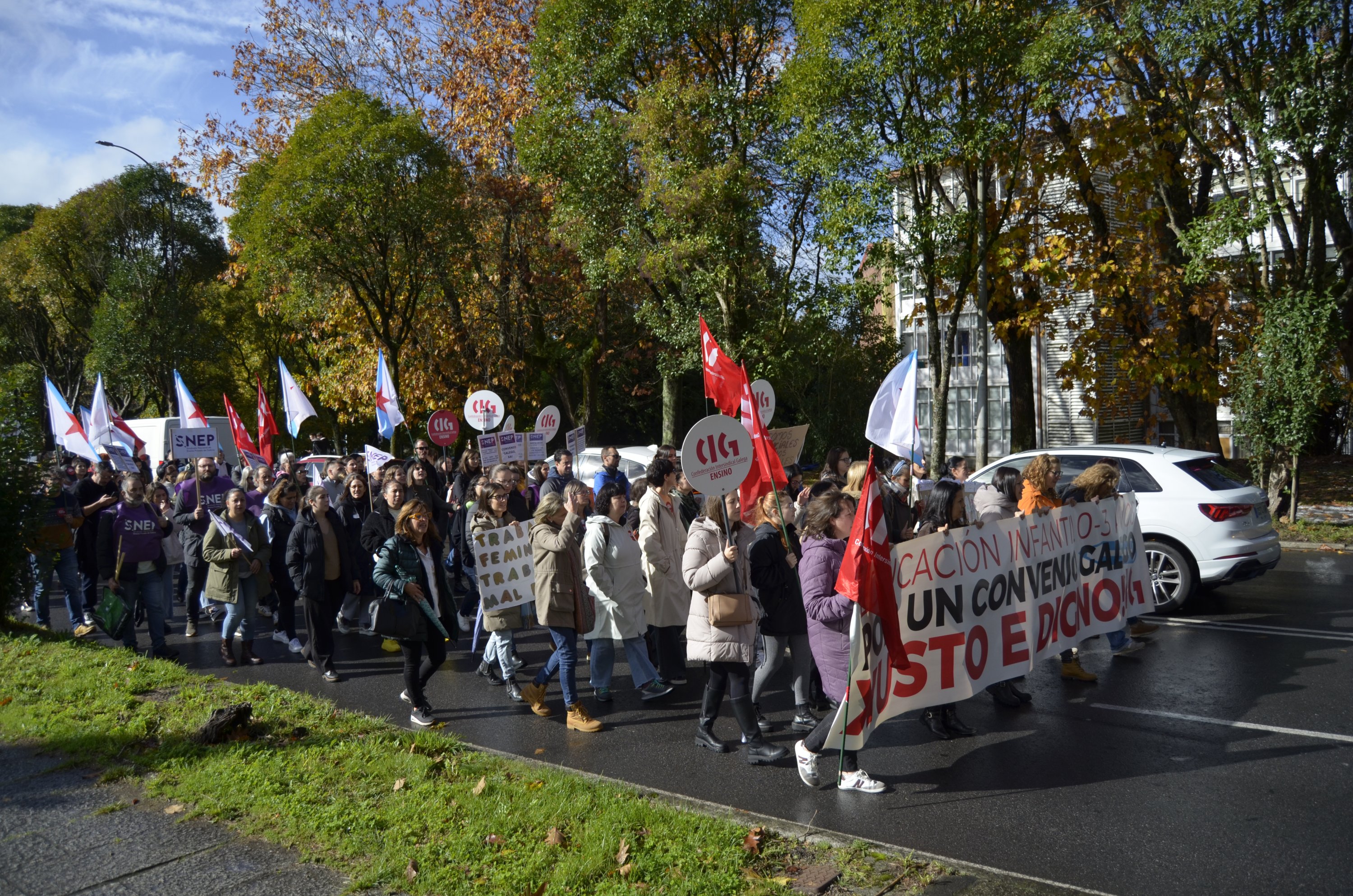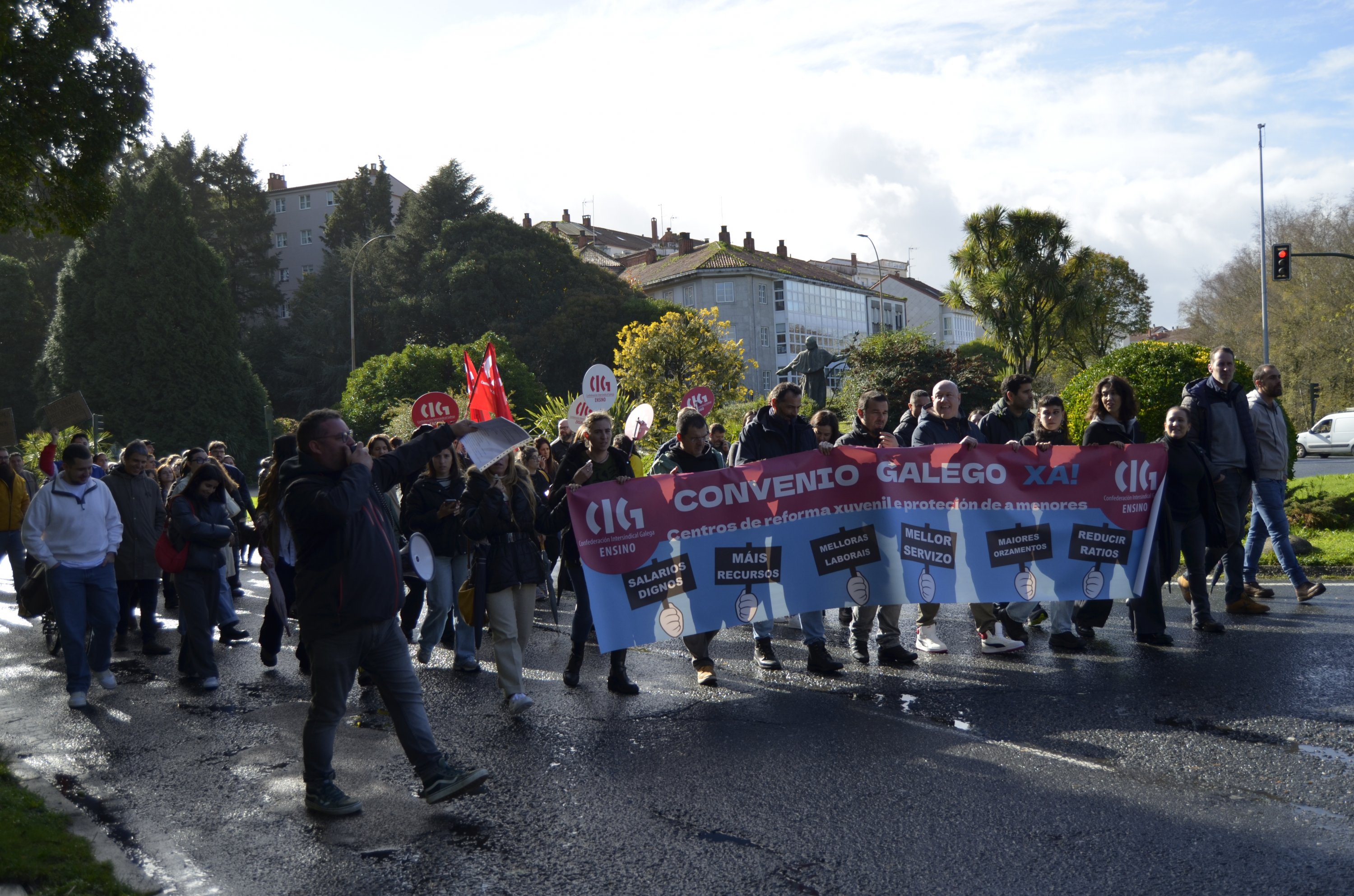 A marcha, na que se estima unha participación superior ao milleiro de persoas, rodeou o edificio administrativo de San Caetano e transcorreu baixo consignas como “traballo feminizado, traballo precarizado”, “convenio galego, salarios dignos” ou “menos discursos e máis recursos” en alusión esta última á conselleira de Política Social que ten as competencias para xestionar estes tres servizos, a maioría deles xestionados por asociacións sen ánimo de lucro en réxime de concerto social. Neste sentido, Germán Estévez, presidente do comité de empresa de Monteledo, un dos dous grandes centros residenciais de Ourense dedicados á reforma xuvenil e a medidas terapéuticas para menores en situacións complexas, indicou que “precisamente o que pedimos é que se nos trate como un servizo público concertado e non coa situación de precariedade tanto salarial e laboral que temos actualmente, con soldos nalgúns casos rozando o SMI, conxelados nos últimos anos, sen pluses de nocturnidade e perigosidade, sen revisar á baixa a ratio de menores por educador/a nin vixiar que se cumpran as estabelecidas, sen a cobertura do persoal de baixa e con moitas dificultades para atopar persoal tanto de forma temporal como permanente. Está pasando que moitas educadoras e e educadores sociais pasan por estes centros só como unha vía intermedia mentres non atopan un traballo mellor... Ademais, a nosa realidade é moi diversa porque hai moitos centros pequenos dedicados á protección de menores en situación de vulnerabilidade, pisos tutelados, casas de acollida, puntos de encontro familiar... que teñen problemáticas particulares que non están a ser atendidas, aínda que as condicións que rexe o convenio estatal nos marquen uns parámetros iguais para todos e todas”.