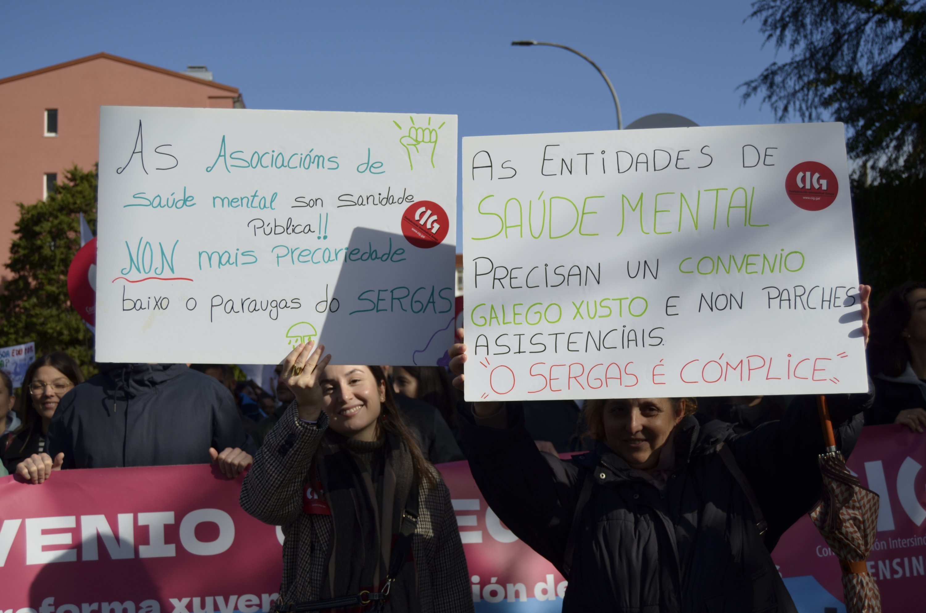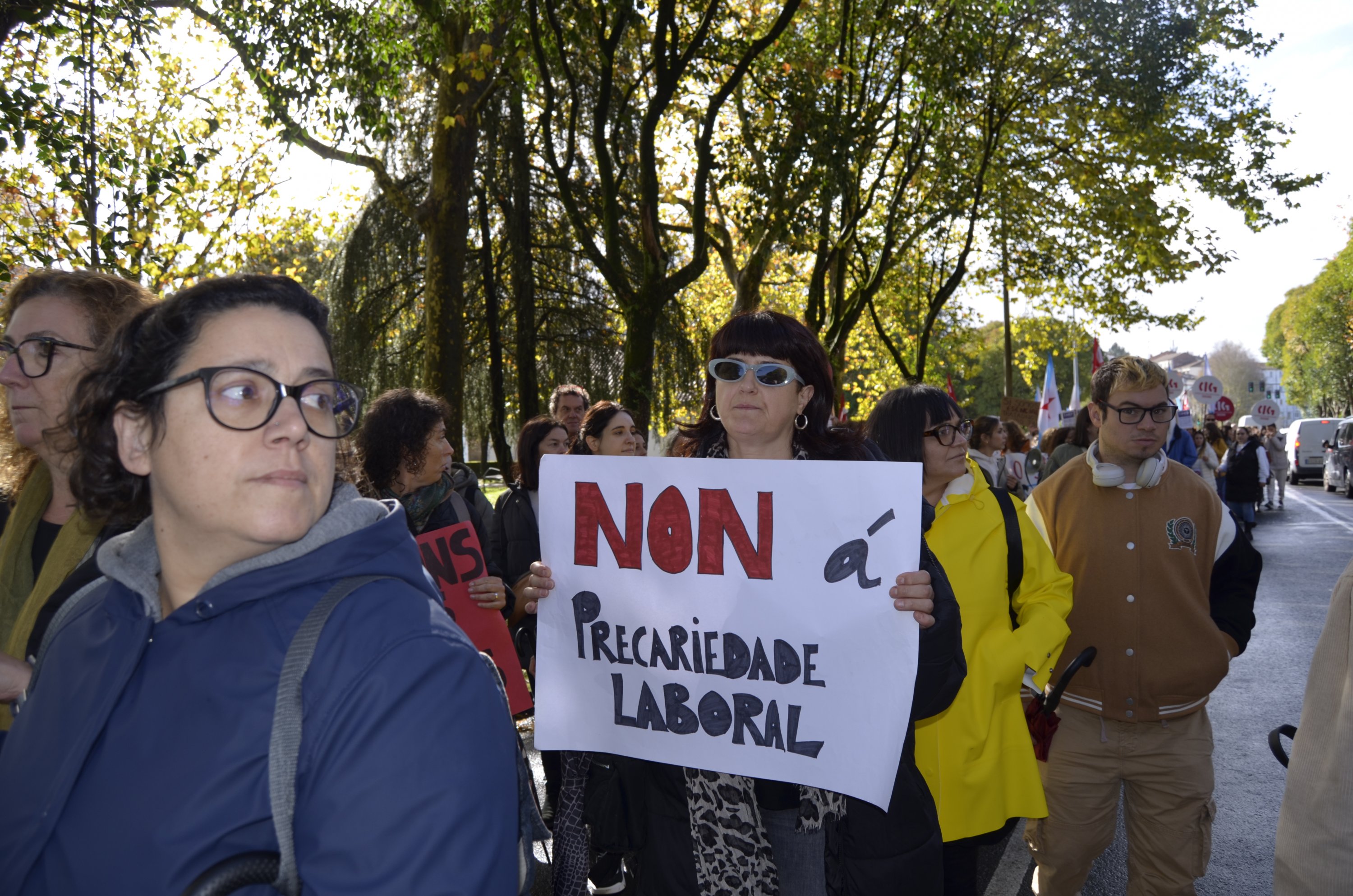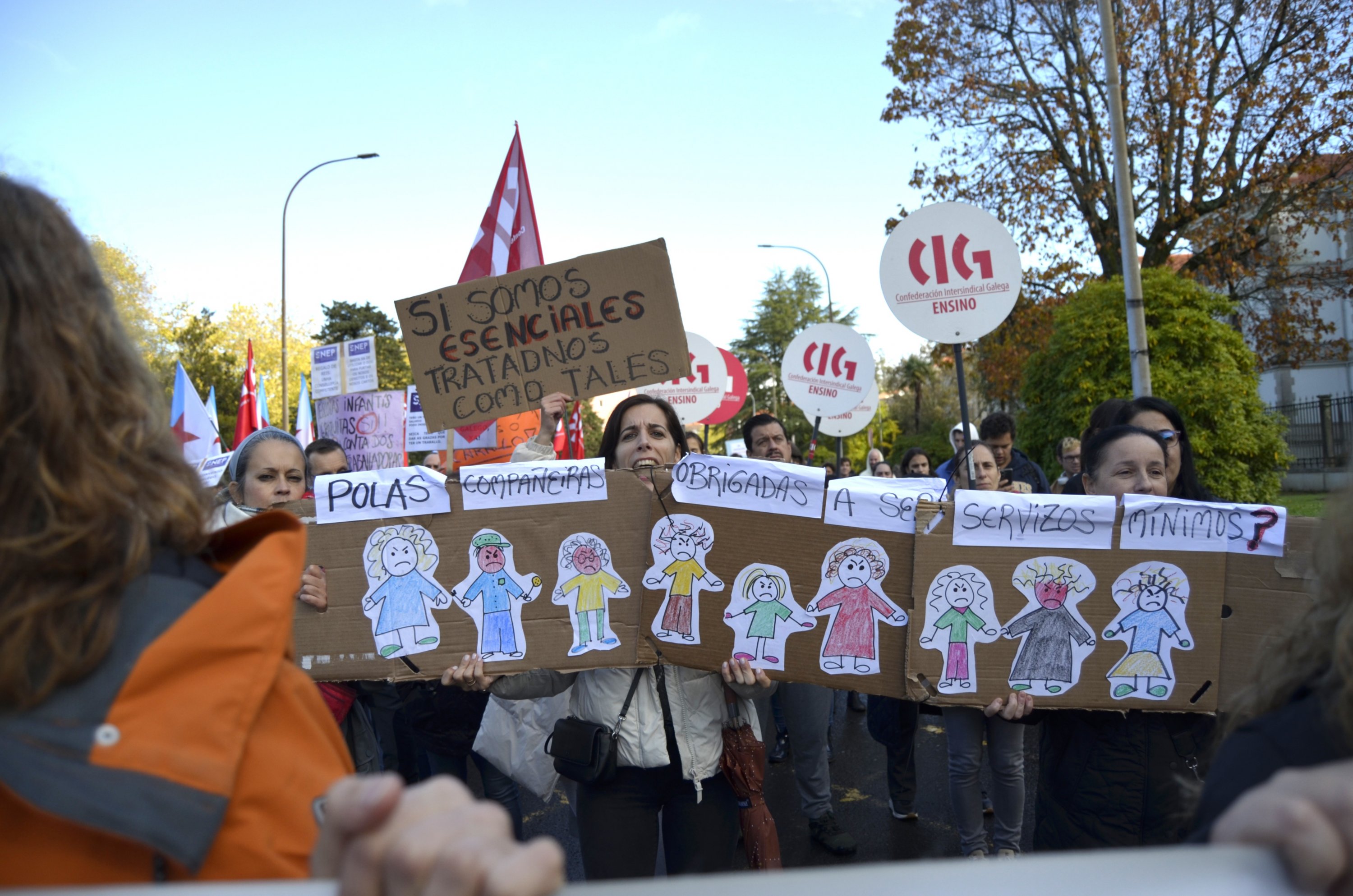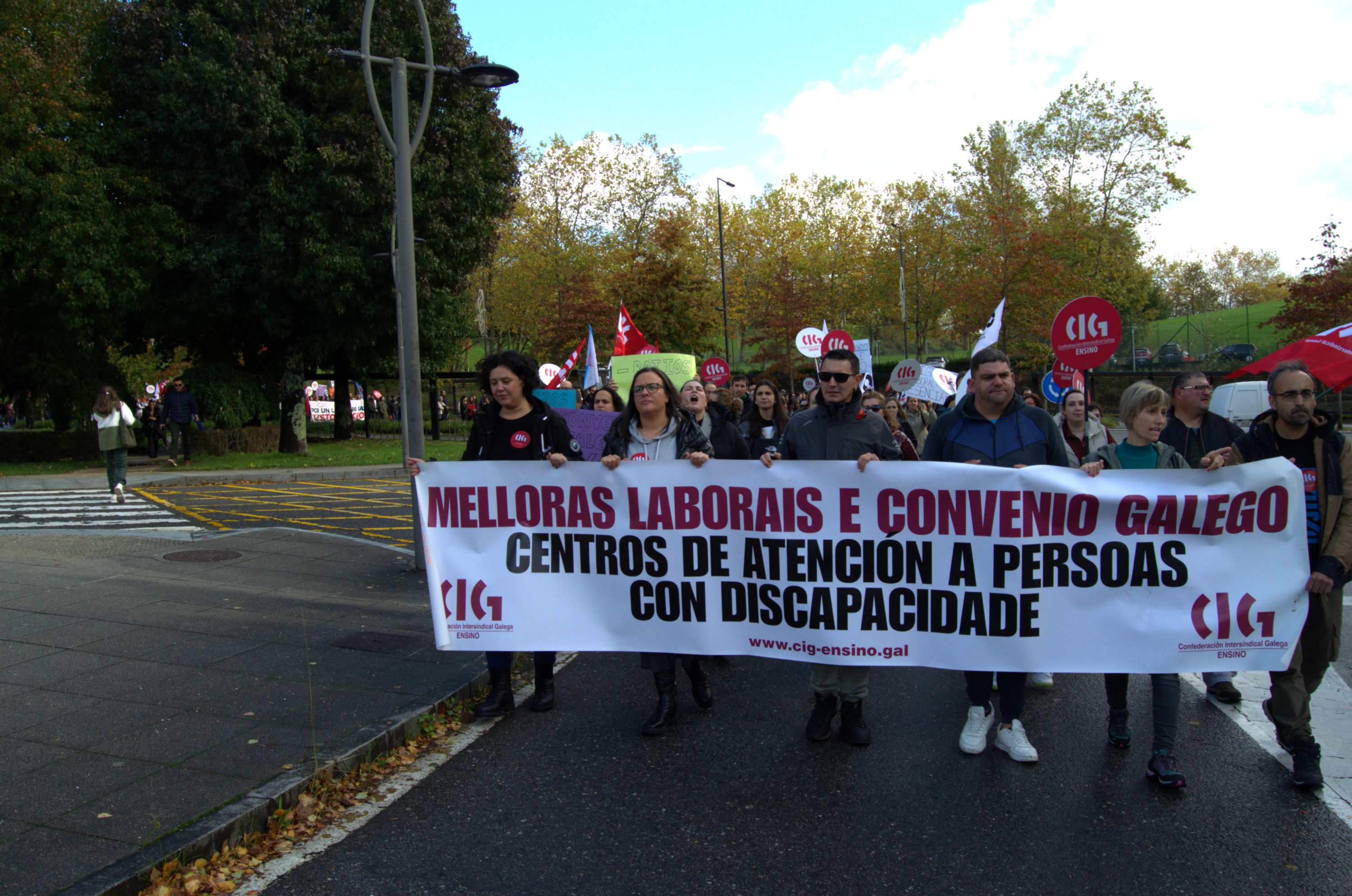 A marcha, na que se estima unha participación superior ao milleiro de persoas, rodeou o edificio administrativo de San Caetano e transcorreu baixo consignas como “traballo feminizado, traballo precarizado”, “convenio galego, salarios dignos” ou “menos discursos e máis recursos” en alusión esta última á conselleira de Política Social que ten as competencias para xestionar estes tres servizos, a maioría deles xestionados por asociacións sen ánimo de lucro en réxime de concerto social. Neste sentido, Germán Estévez, presidente do comité de empresa de Monteledo, un dos dous grandes centros residenciais de Ourense dedicados á reforma xuvenil e a medidas terapéuticas para menores en situacións complexas, indicou que “precisamente o que pedimos é que se nos trate como un servizo público concertado e non coa situación de precariedade tanto salarial e laboral que temos actualmente, con soldos nalgúns casos rozando o SMI, conxelados nos últimos anos, sen pluses de nocturnidade e perigosidade, sen revisar á baixa a ratio de menores por educador/a nin vixiar que se cumpran as estabelecidas, sen a cobertura do persoal de baixa e con moitas dificultades para atopar persoal tanto de forma temporal como permanente. Está pasando que moitas educadoras e e educadores sociais pasan por estes centros só como unha vía intermedia mentres non atopan un traballo mellor... Ademais, a nosa realidade é moi diversa porque hai moitos centros pequenos dedicados á protección de menores en situación de vulnerabilidade, pisos tutelados, casas de acollida, puntos de encontro familiar... que teñen problemáticas particulares que non están a ser atendidas, aínda que as condicións que rexe o convenio estatal nos marquen uns parámetros iguais para todos e todas”.