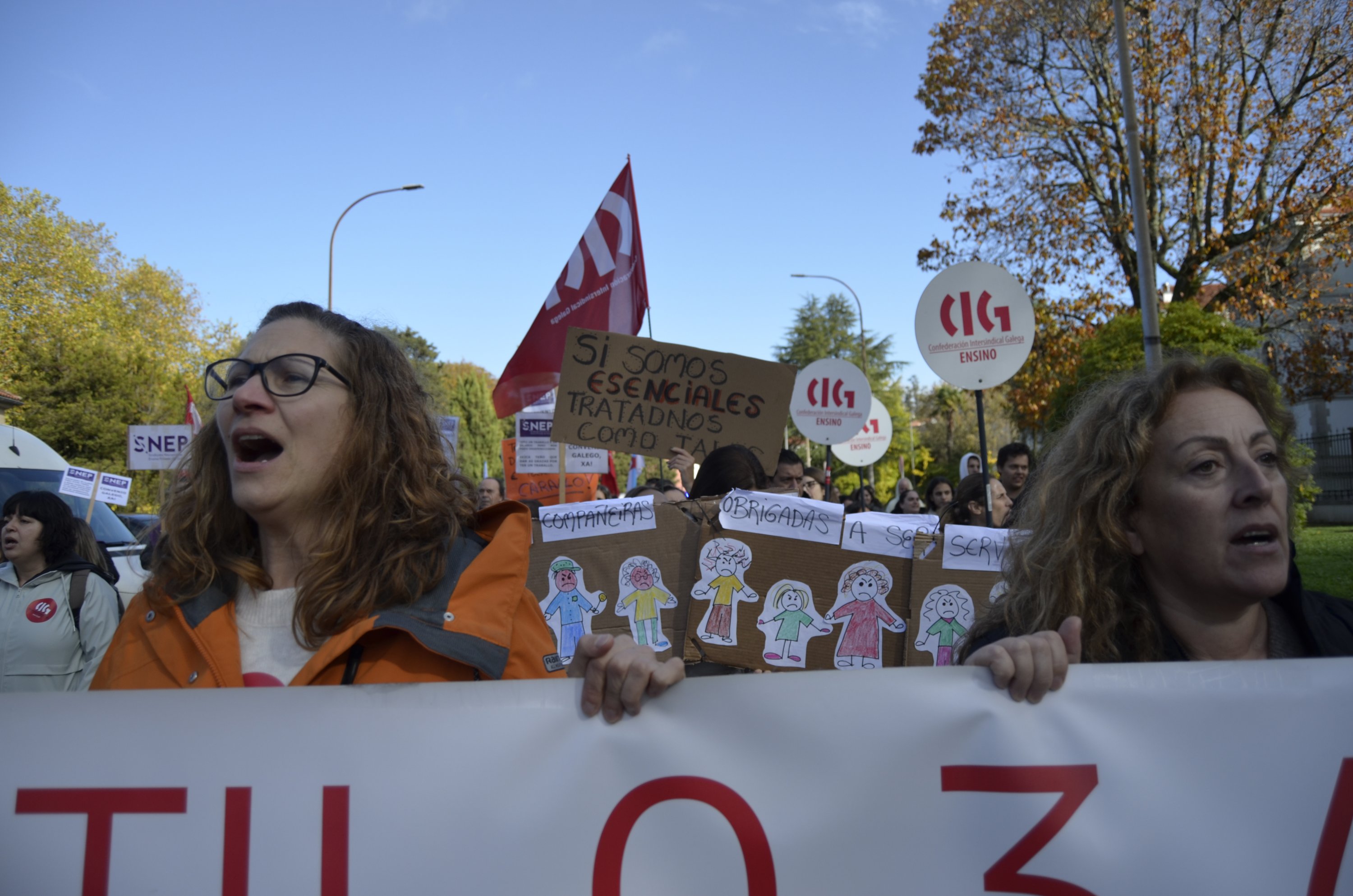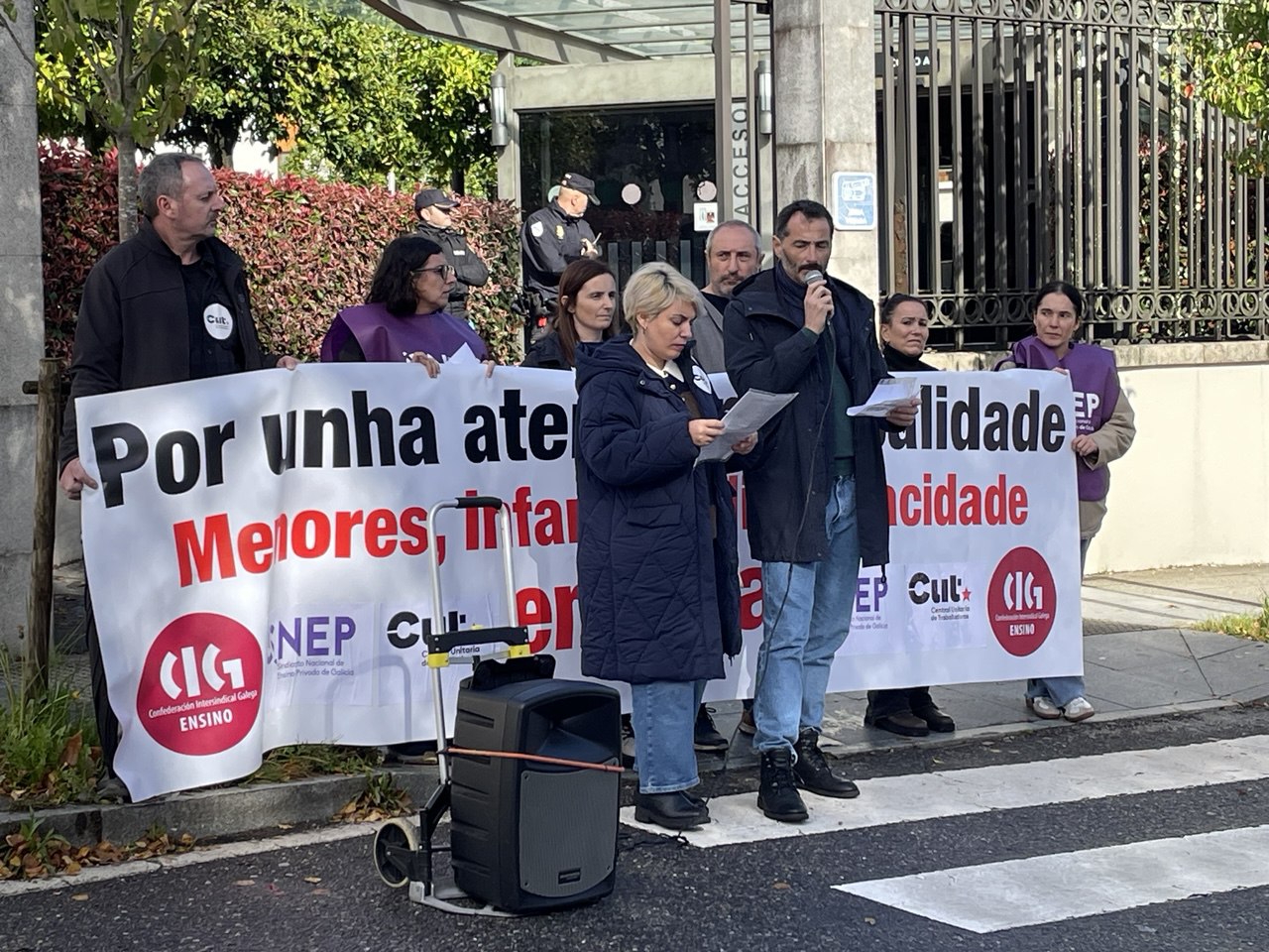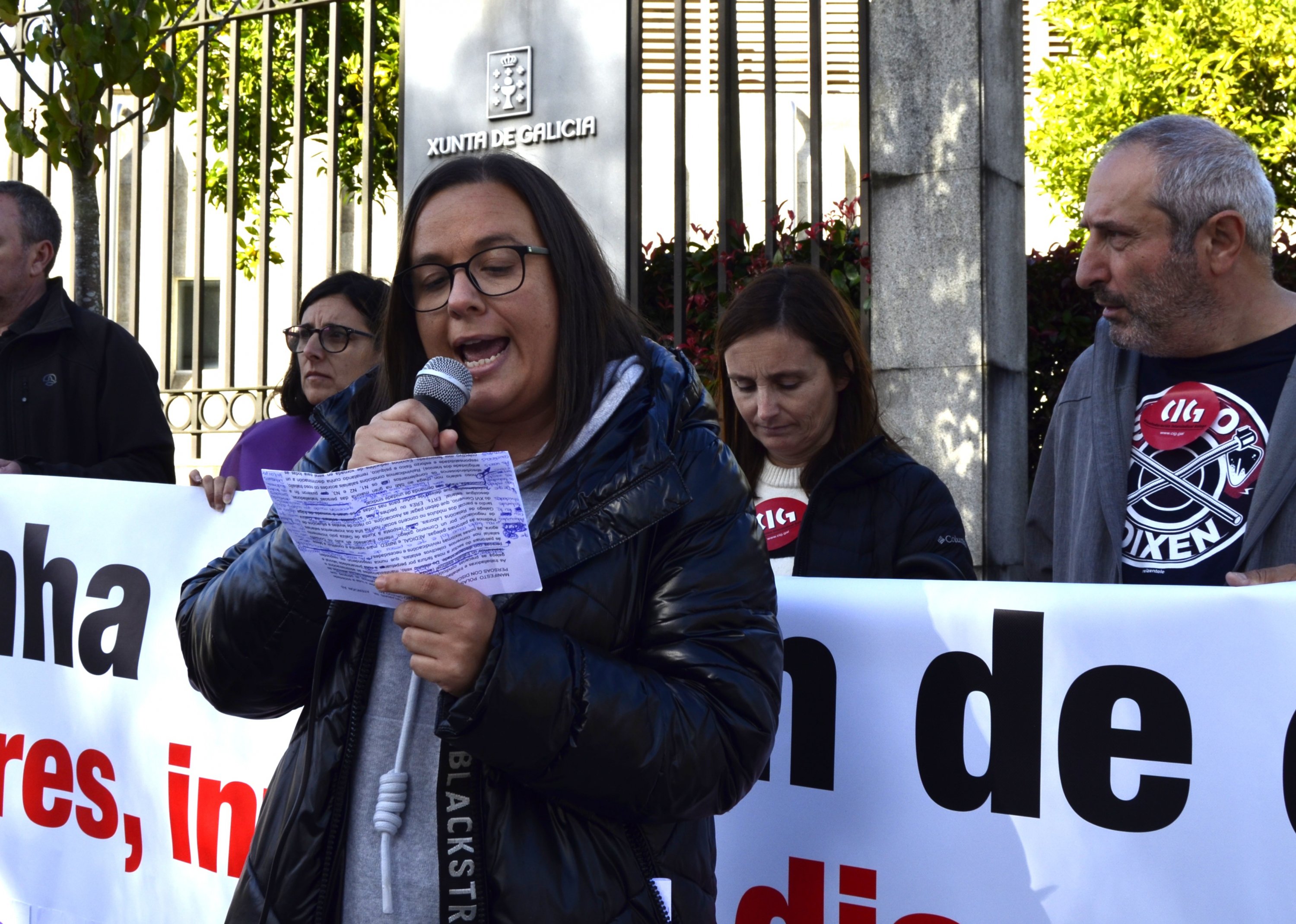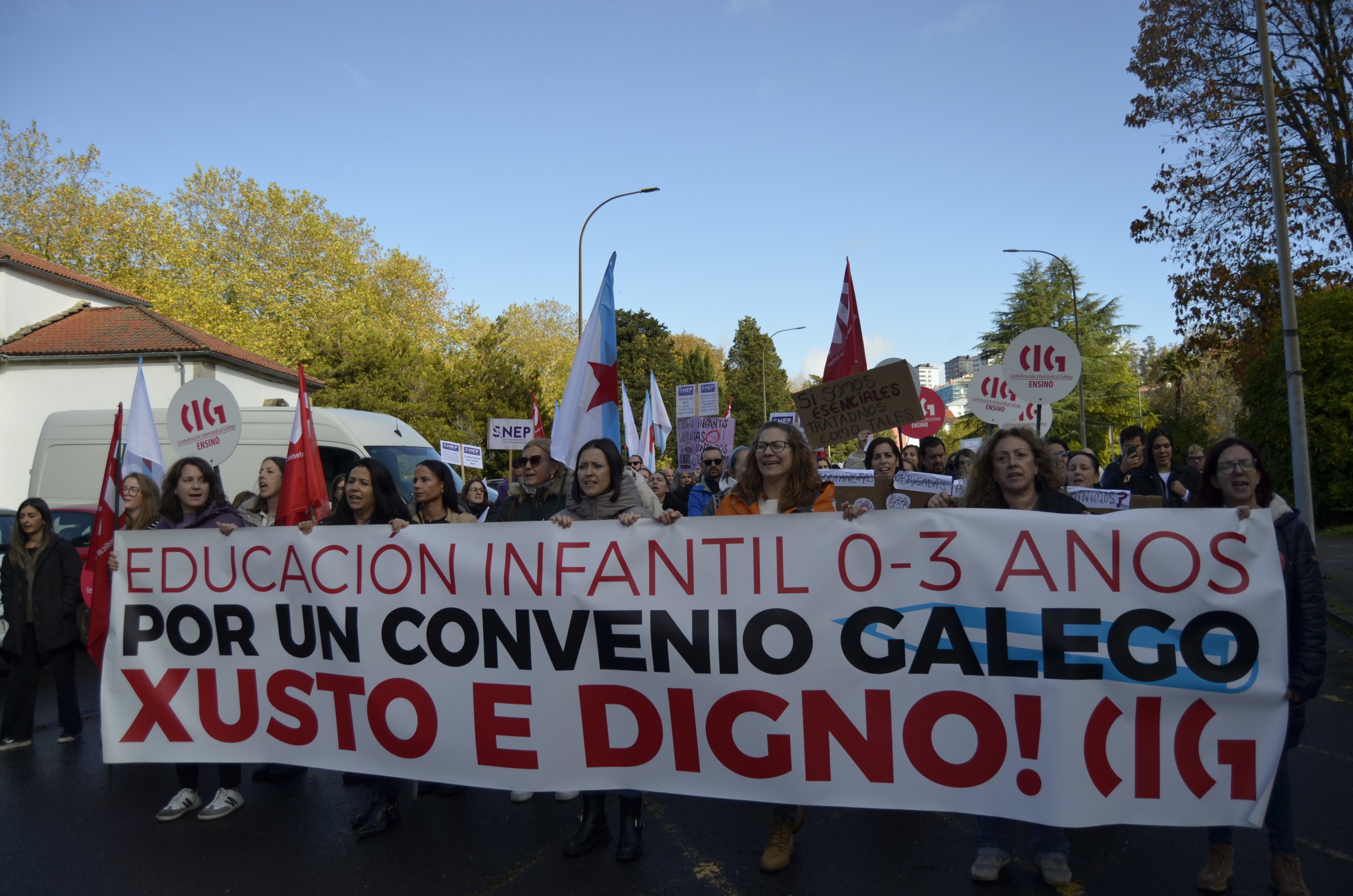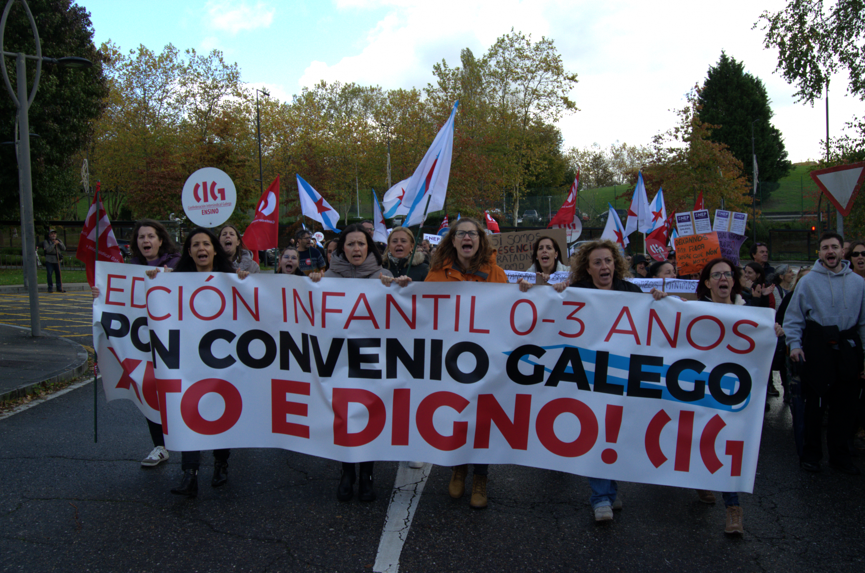 Pola súa banda, na lectura final do manifesto, Lucía Barros, delegada da CIG na Escola Infantil Príncipe Felipe de Pontevedra, volveu incidir en que as traballadoras do primeiro ciclo de infantil están consideradas “traballadoras pobres”, con salarios por debaixo do SMI, con ratios inasumíbeis de até 8 menores de un ano por cada traballadora ou até 20 de dous a tres anos, sen horario laboral para preparar as actividades, dado que é todo de atención directa. Nós non coidamos, nós educamos, e esa tarefa está claramente desvalorizada”. Tamén se mencionou que o convenio estatal non dá resposta ás peculiaridades de Galiza onde é gratuíta a matrícula para as familias nas escolas infantís -a través das subvencións da Xunta financiadas con fondos europeos- e iso non reverteu en mellores condicións laborais para as súa traballadoras que malia encargarse de atender e educar a nenos/as cando se trata da súa conciliación familiar e laboral non teñen ningún dereito a maiores dos recollidos no Estatuto dos e das Traballadoras.