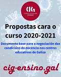 A solución, como xa concluímos no noso documento de propostas, pasa pola diminución de ratios e a contratación de máis profesorado que poida estar máis tempo co seu grupo, sobre todo nas etapas de Infantil, Educación Especial e Educación Primaria. Neste sentido, desde a CIG-Ensino botamos en falta a concreción da contía económica que se vai destinar a sufragar a nova normalidade nos centros educativos, que si teñen estimadas outras comunidades autónomas. Non imos consentir que os fondos necesarios para fortalecer o ensino público e a presencialidade, despois de que se evidenciara que a teledocencia non é nin sequera un parche, sexan destinados a outros fins, como o propio Feijóo solicitou na conferencia de presidentes autonómicos, nin se distribúan co ensino privado e concertado. Esiximos pois unha negociación inminente con cifras e protocolos claros enriba da mesa e ofrecemos partir da nosa proposta de plans de actuación nos centros educativos e que contempla medidas estruturais, sanitarias, educativas, laborais e sociais.
