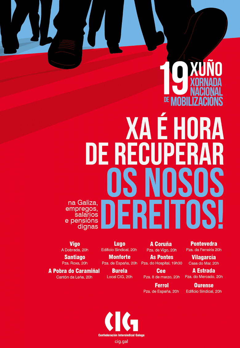 Porén, e dado que o propio partido socialista foi cómplice dalgunha destas medidas, a CIG manterase vixiante ante o cumprimento destas premisas e mantén o carácter reivindicativo do día 19 de xuño. Por iso fai un chamamento aos traballadores e traballadoras, o colectivo de pensionistas, de desempregados, de estudantes... a todas aquelas persoas que sufriron os recortes e as consecuencias máis virulentas da crise a participar nas manifestacións que está previsto que teñan lugar en todas as vilas e comarcas galegas.