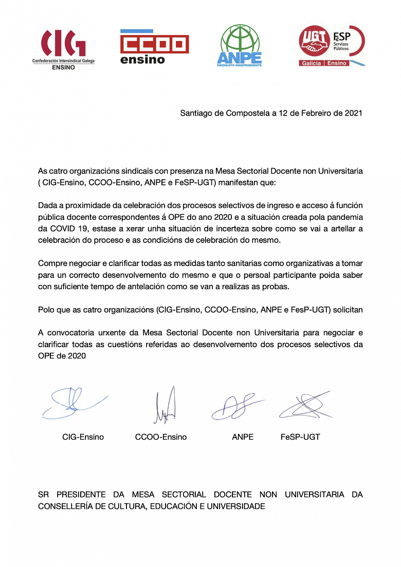 Polo que CIG-Ensino, CCOO-Ensino, ANPE e FesP-UGT solicitamos a convocatoria urxente da Mesa Sectorial Docente non Universitaria para negociar e clarificar todas as cuestións referidas ao desenvolvemento dos procesos selectivos da OPE de 2020.