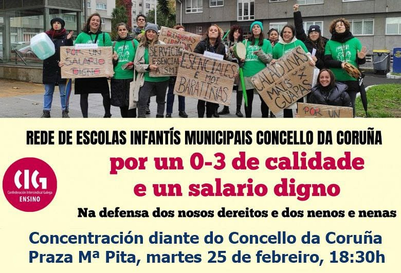 "As traballadoras da rede de escolas infantís merecemos exercer a nosa profesión en condicións dignas, e as nenas e nenos teñen dereito a escolas de calidade que garantan unha mellor atención e coidados", aseveran. Por iso, reclámanlle ao Concello da Coruña, que ten privatizada a xestión destes centros, solucións inmediatas "e o compromiso por unha educación de calidade na etapa 0-3", máis cando o concelleiro de educación, Juan Borrego, se comprometera en 2024 a abrir negociacións e agora desdise dende o bunquer de Mª Pita.
