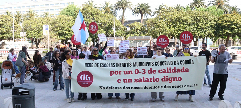 As traballadoras da rede de escolas infantís municipais do Concello da Coruña concentráronse esta tarde no Obelisco para reclamar “feitos concretos” no cumprimento da moción aprobada no pleno do pasado 10 de abril. Salientan que, entre outras cuestións, o texto recolle o compromiso do Concello de elaborar á maior brevidade uns novos pregos que supoñan unha mellora no servizo educativo e asistencial, así como das condicións salariais, laborais e do calendario escolar.