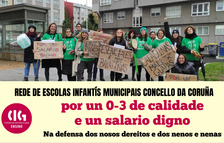 Nesa data, a representación legal das traballadoras e a CIG-Ensino mantiveron unha reunión co concellal, ao que lle entregaron por escrito unha serie de demandas urxentes para mellorar as condicións laborais, tendo en conta que o vindeiro ano sairán os novos pregos do servizo. Hai que subliñar que as escolas 0-3 anos da rede municipal son propiedade do Concello da Coruña pero a súa xestión está privatizada e o convenio que se lle aplica ao persoal é o estatal de educación infantil, cuxas negociacións están estancadas dende 2021 e que contempla condicións salariais e laborais de miseria.