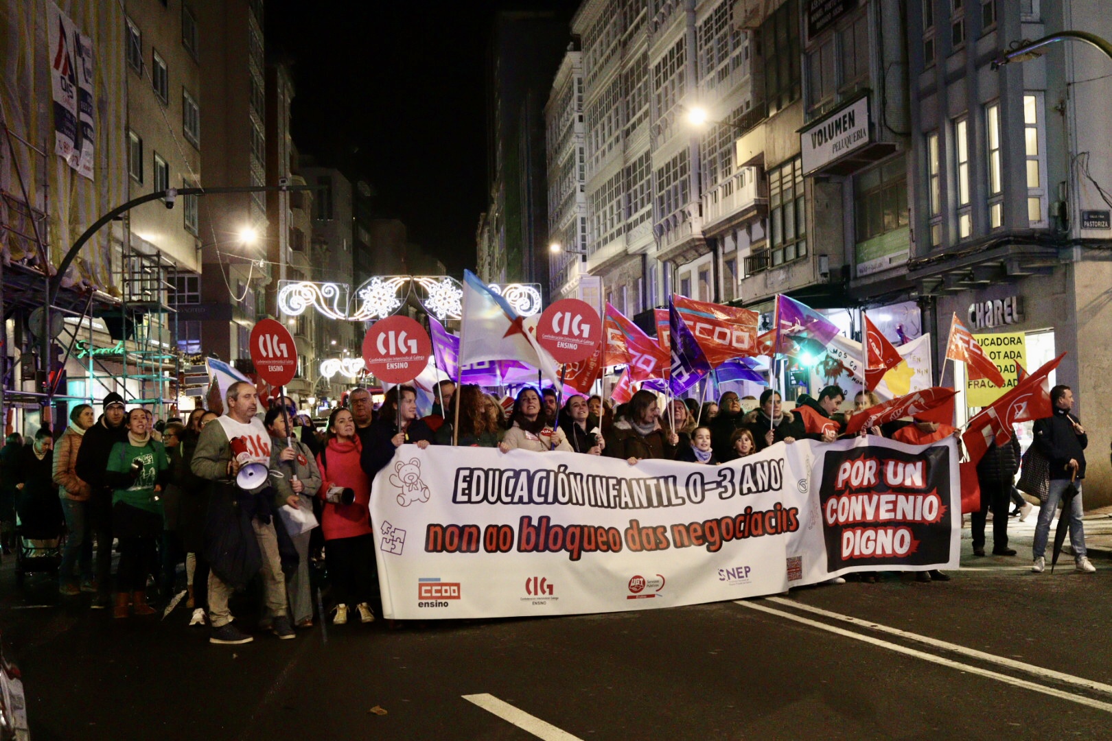 Traballadoras das escolas infantís privadas e de xestión indirecta, na etapa 0-3, mobilizáronse na tarde deste martes polas rúas da Coruña, Vigo e Compostela para demandar un convenio digno con salarios xustos e rexeitar a actitude inmobilista da patronal