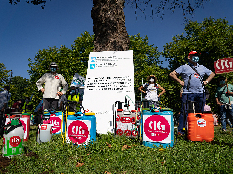 Representantes das organizacións sindicais do ensino, de ANPAs, profesorado, alumnado déronse cita esta mañá en Compostela para reclamar outro Protocolo que faga fronte á pandemia do coronavirus o próximo curso escolar. Nunha acción conxunta e unitaria que se desenvolveu cunha cazolada e un acto simbólico no que fumigaron o documento presentado pola Consellaría de Educación, púxose de manifesto o total rexeitamento da comunidade educativa ás instrucións da administración. Os principais motivos desta rexeitamento pasan pola ausencia de medidas efectivas que minimicen os contaxios, mantendo as avultadas ratios existentes no ensino público galego, reducindo a distancia de seguridade a un metro (fóra dos grupos estábeis que son inviábeis), sen seguir ningunha das recomendacións sanitarias de organismos como a OMS ou do que establece o Ministerio de Sanidade e negando a posibilidade de incrementar o persoal docente e non docente para facer fronte a todas as medidas organizativas, de gardas, quendas de vixilancia e limpeza que establece o protocolo.